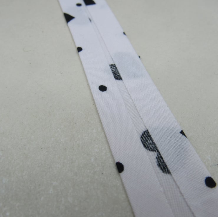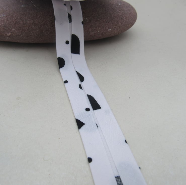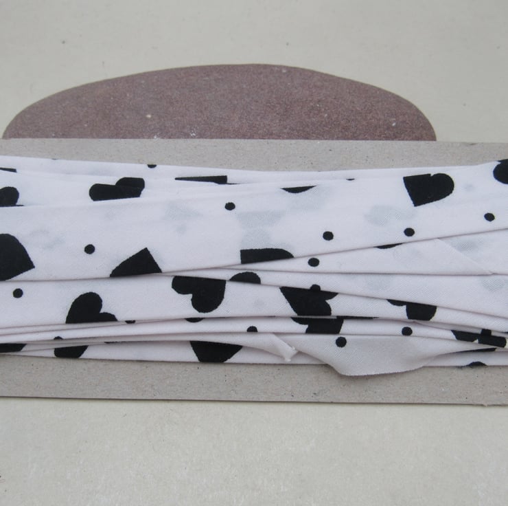 Handmade 0.7" (18mm) folded bias binding in white cotton, patterned with black hearts and dots.