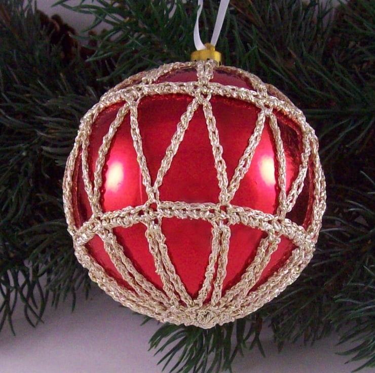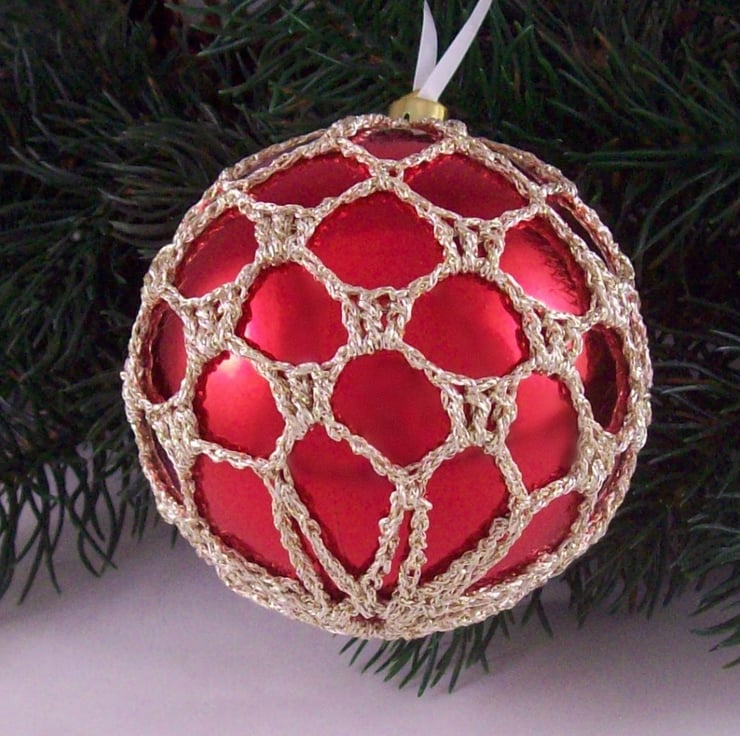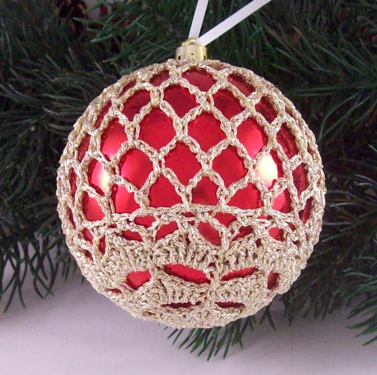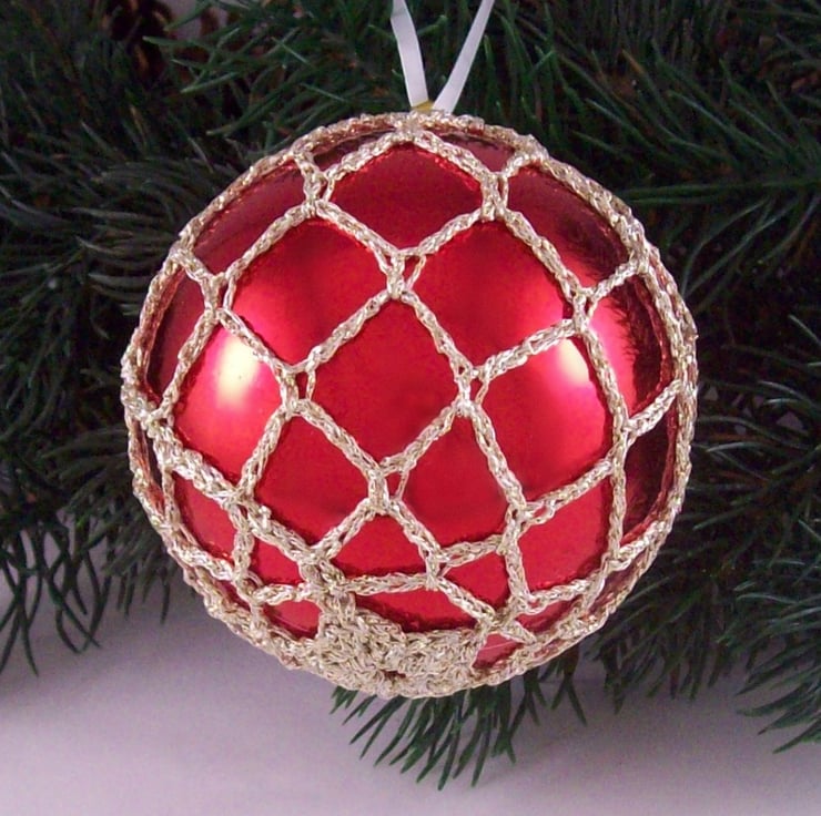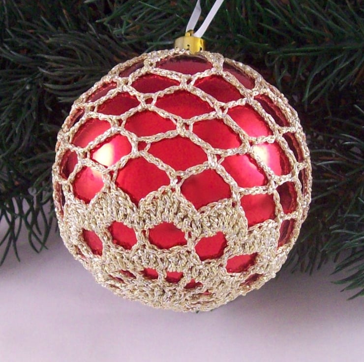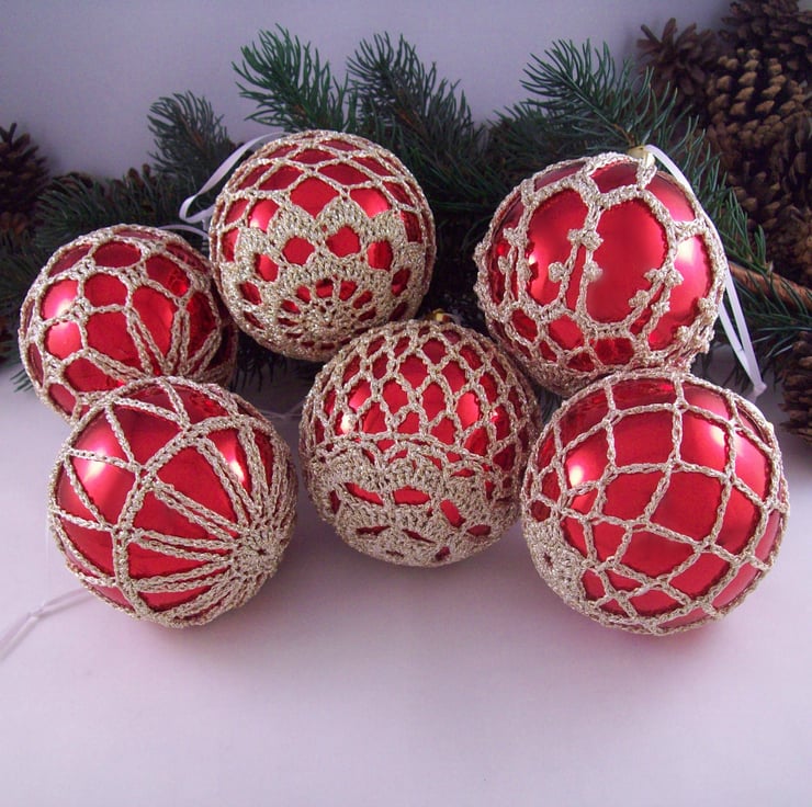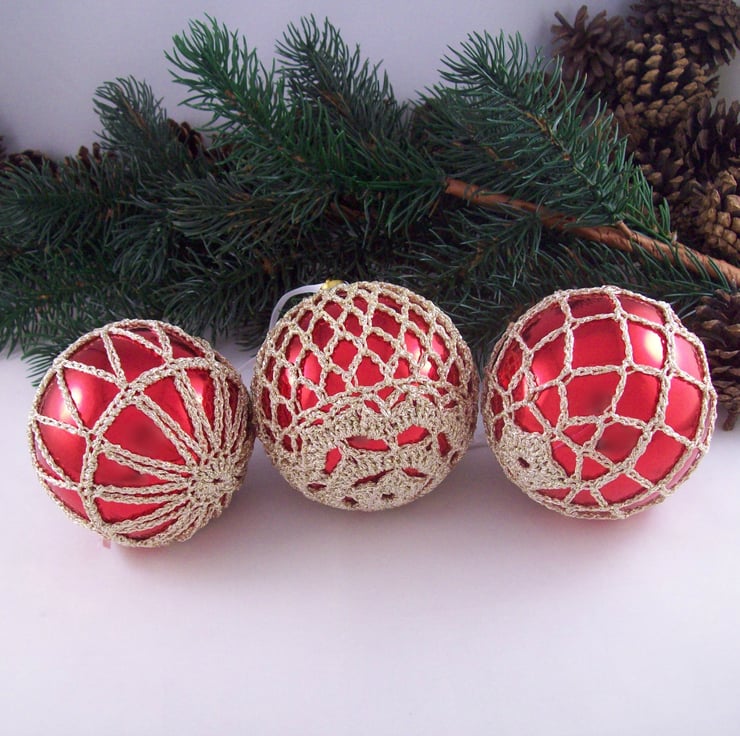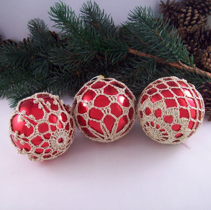 Discover the charm of this unique set of exquisite bright red baubles, beautifully enhanced with hand-crocheted lace in a pale gold colour of sparkly Twilleys Goldfingering—an enchanting addition to your Christmas tree!