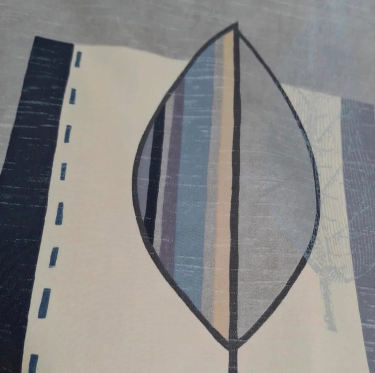 This fabric features a contemporary leaf motif in soft blue, lilac and charcoal tones set against a pale grey background, arranged in a modern geometric layout.