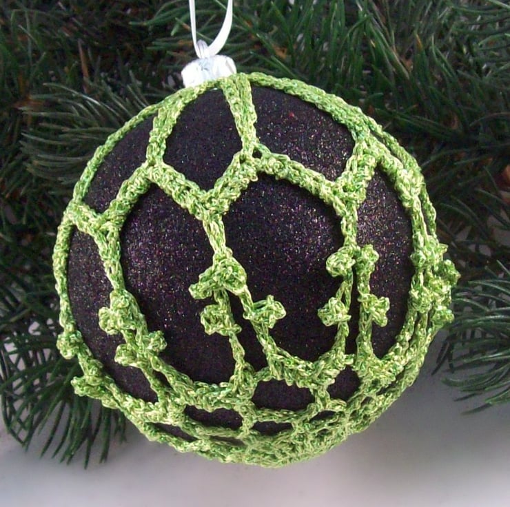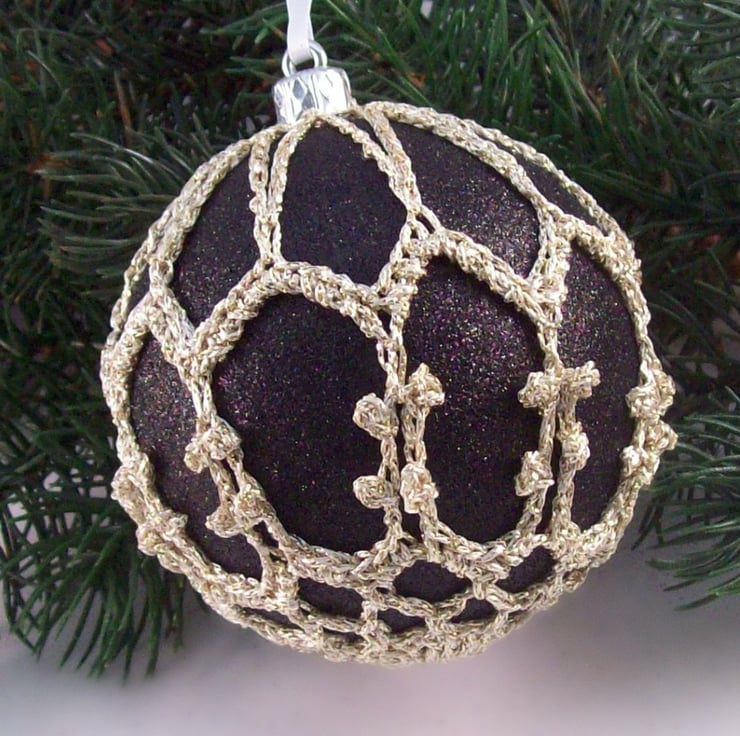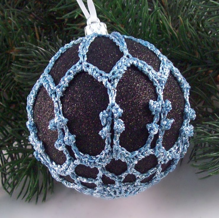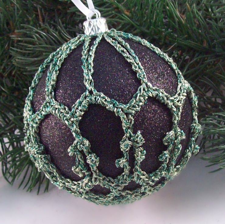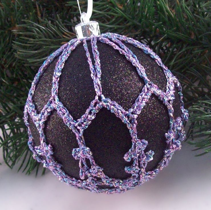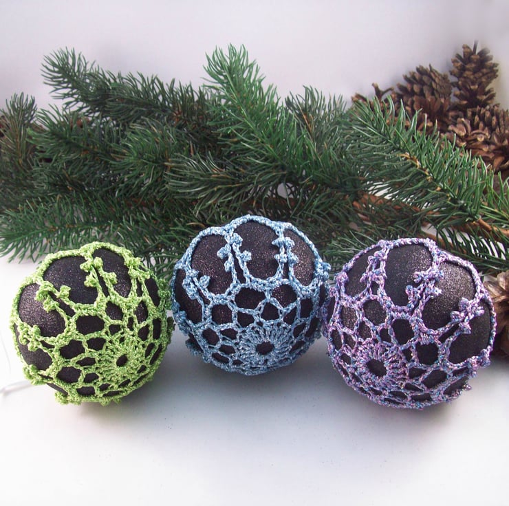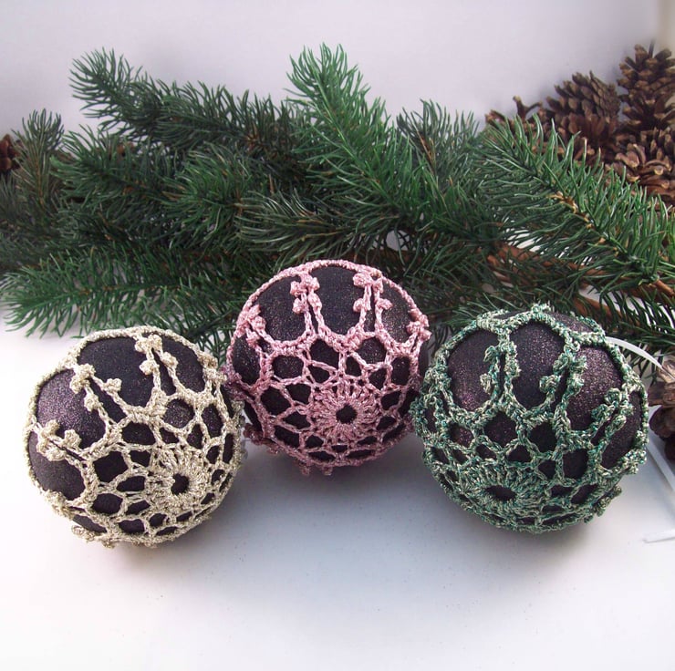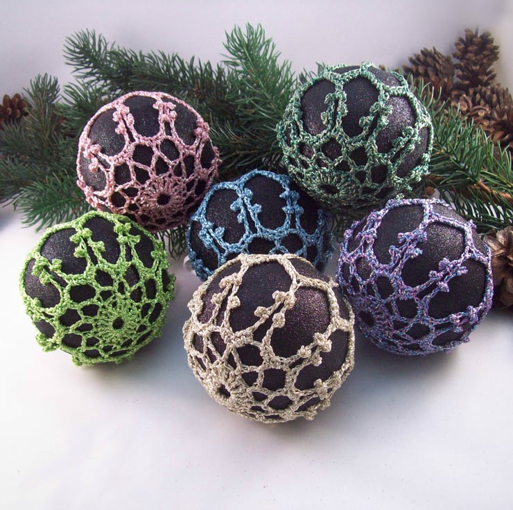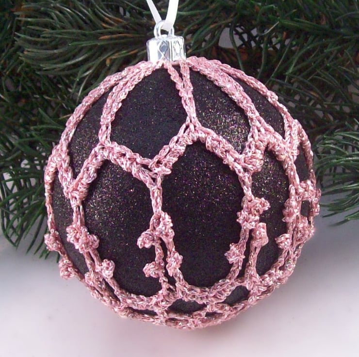 Discover the charm of this unique set of exquisite glittery black baubles, beautifully enhanced with hand-crocheted lace in a range of pastel colours of sparkly Twilleys Goldfingering—an enchanting addition to your Christmas tree!