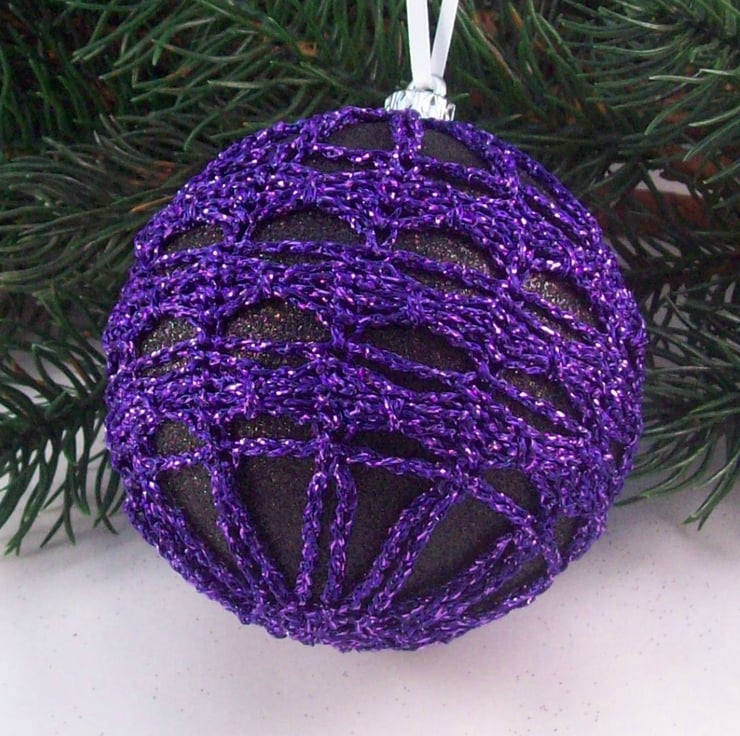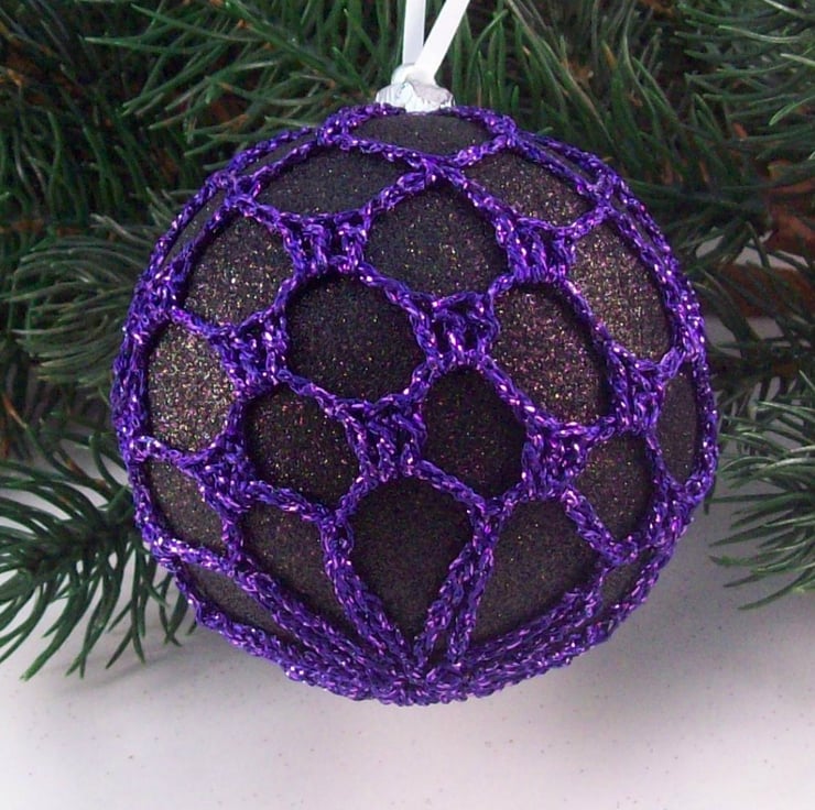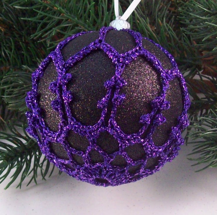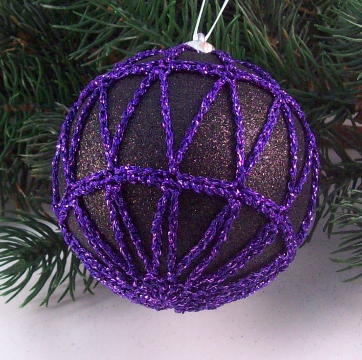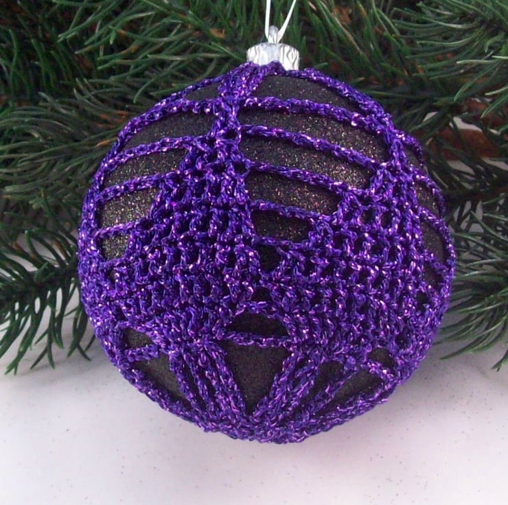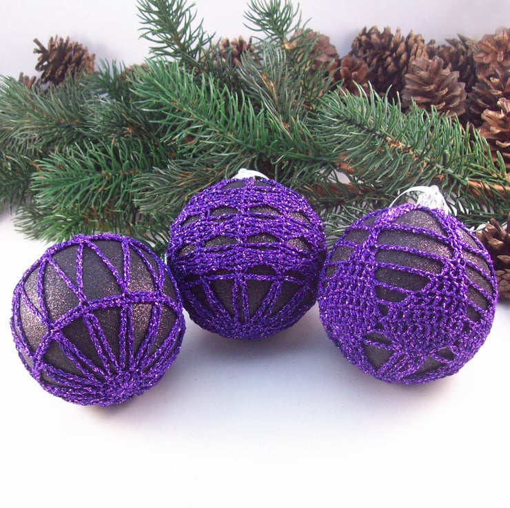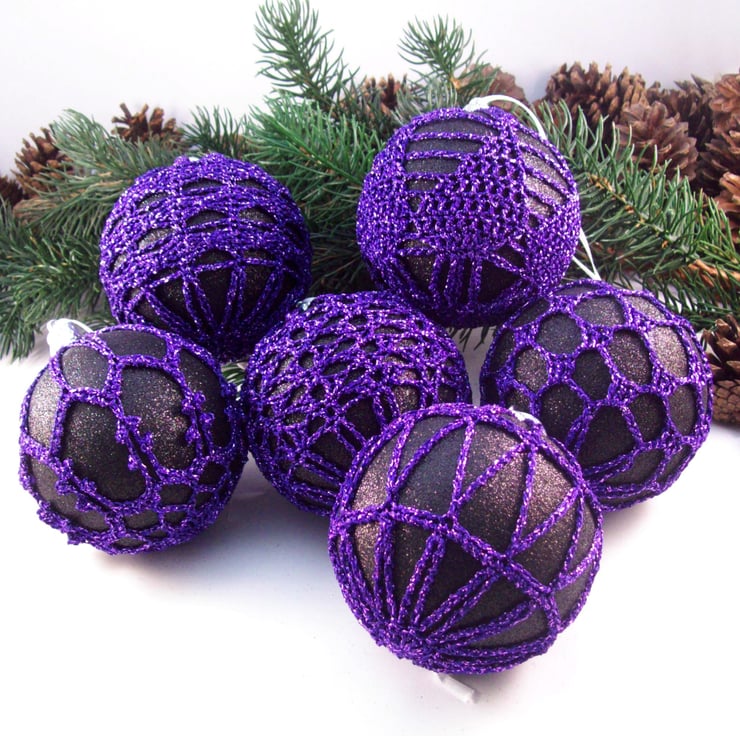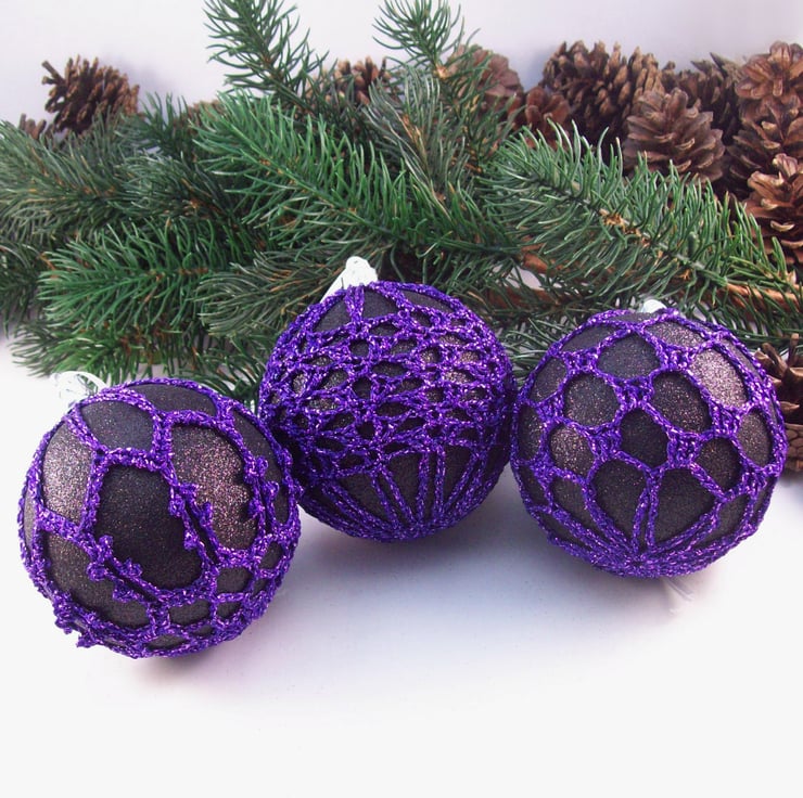 Discover the charm of this unique set of exquisite glittery black baubles, beautifully enhanced with hand-crocheted lace in a purple colour of sparkly Twilleys Goldfingering—an enchanting addition to your Christmas tree!