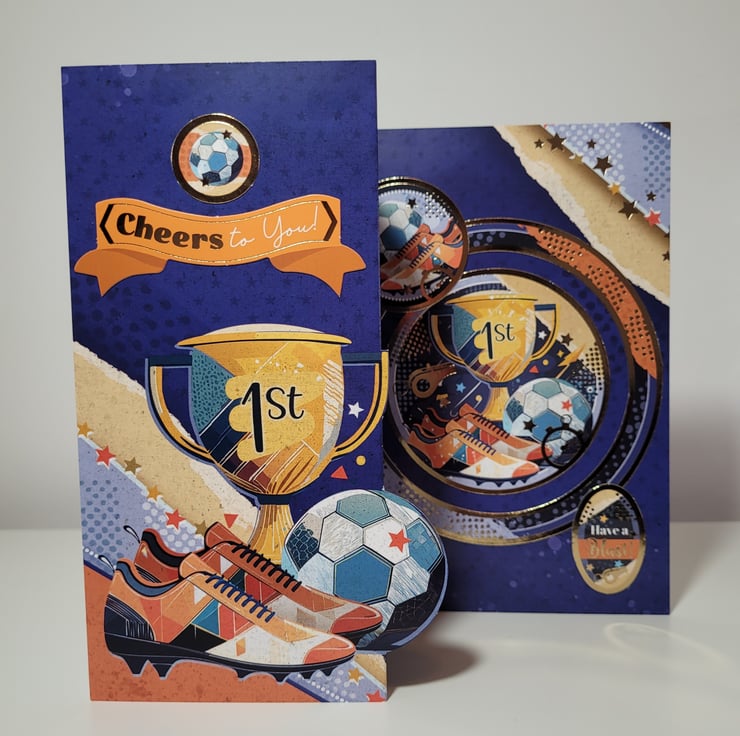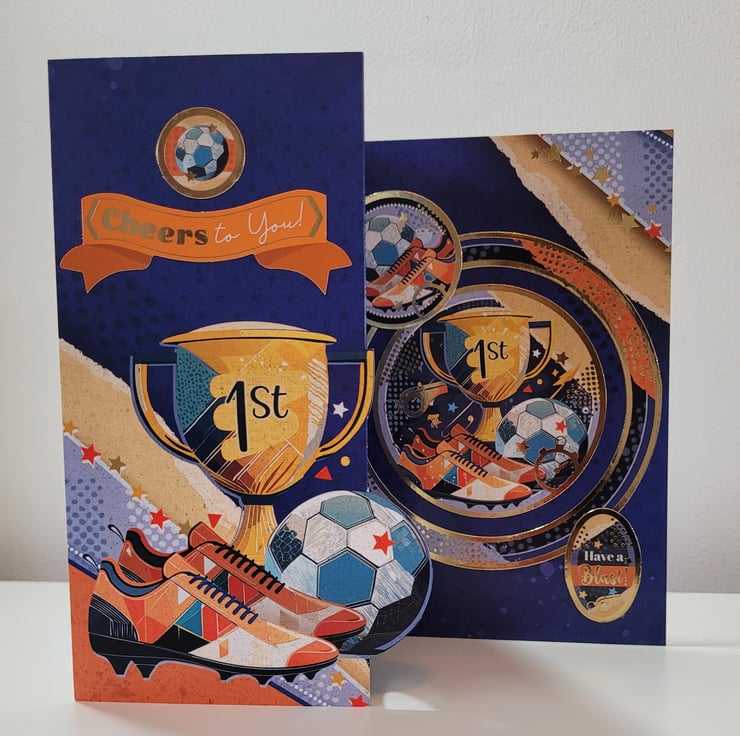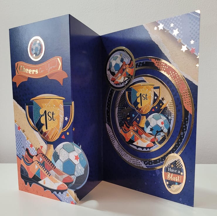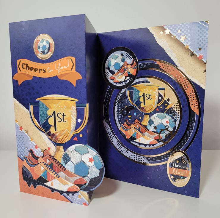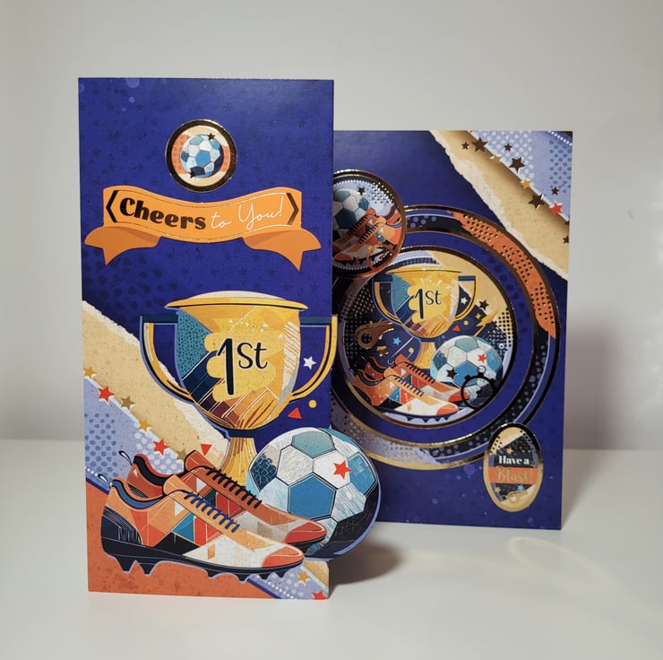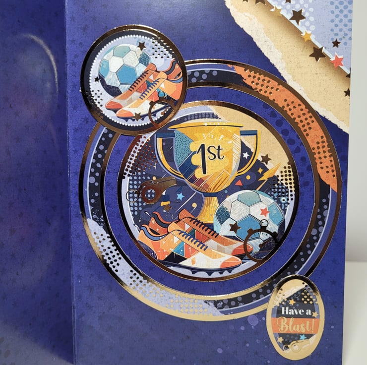 The card features coordinating images throughout in a stylish orange and blue colour theme which has been accented with gold foiling to add that extra touch of 'special'. If you would like the card personalised with an age, please specify in the box