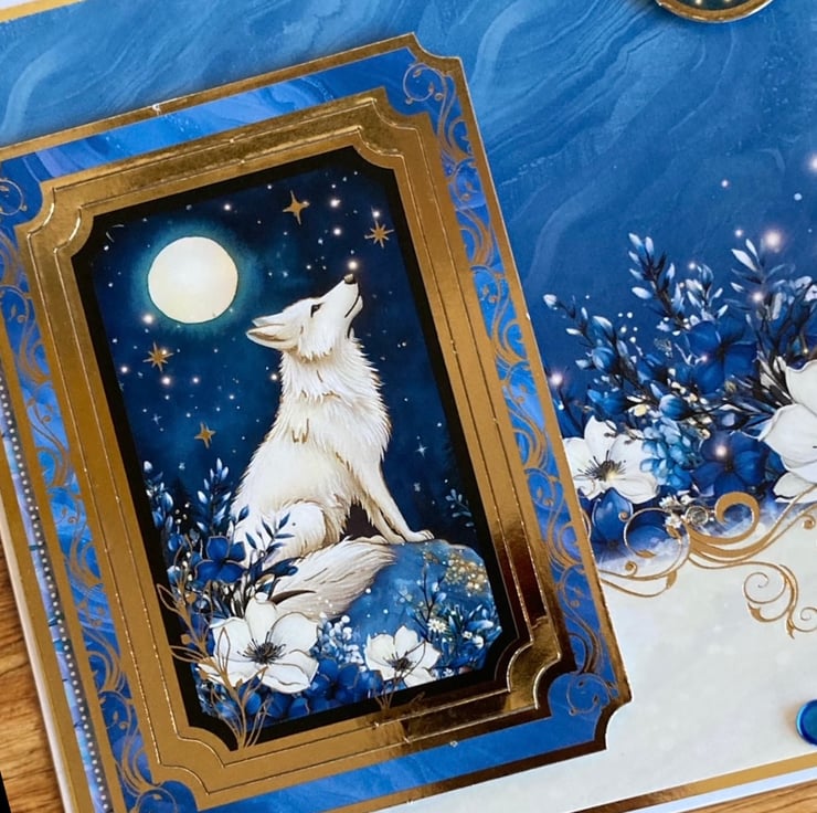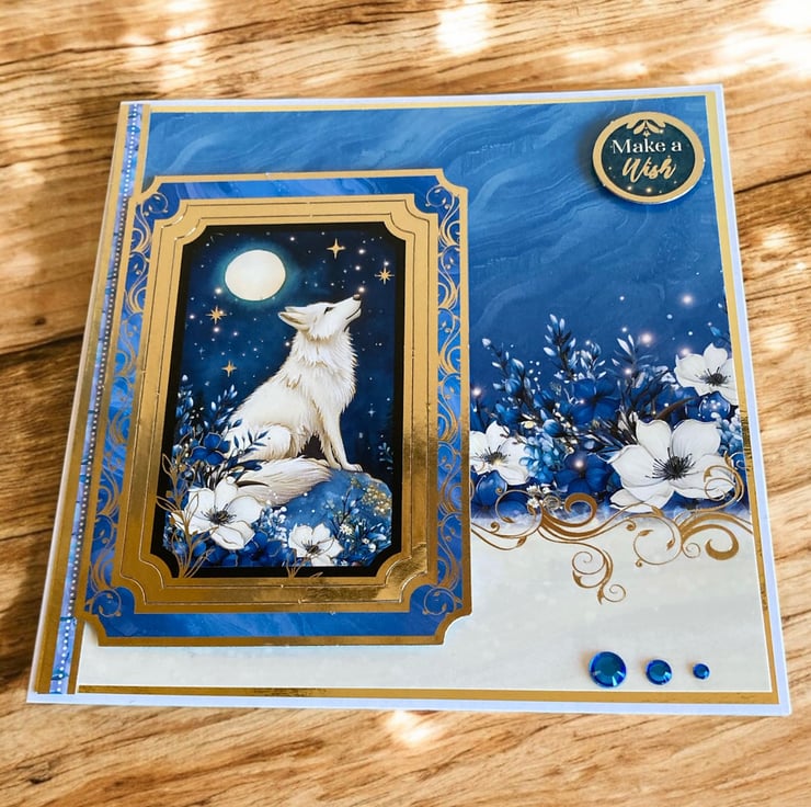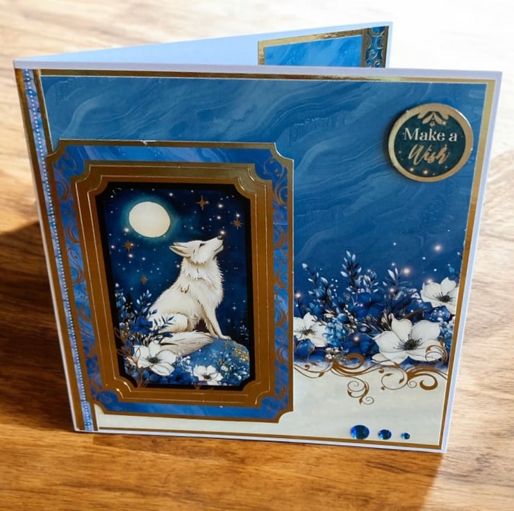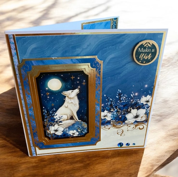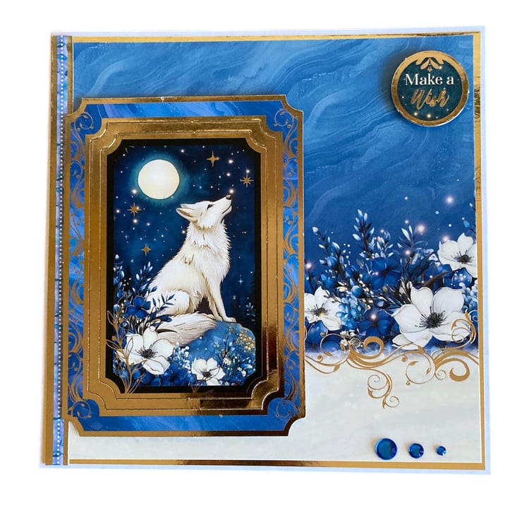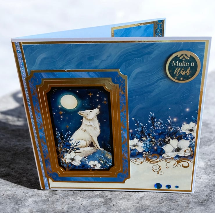 The design features a striking white wolf howling beneath a glowing full moon, framed in rich blues and accented with elegant gold details. Layered elements, the “make a wish” sentiment and an ornate frame give the card a luxurious, keepsake quality that feels truly special.