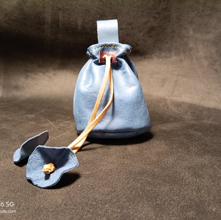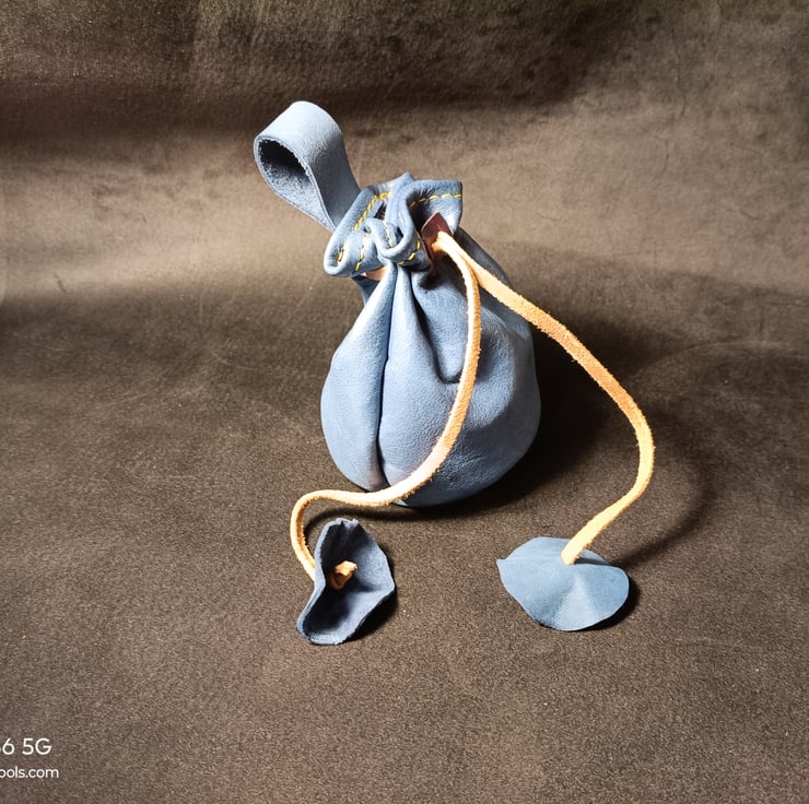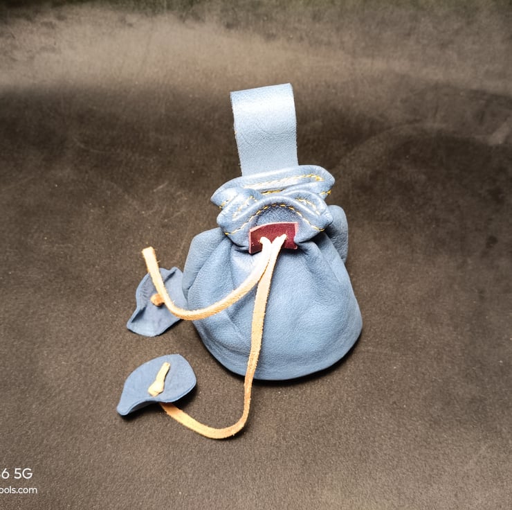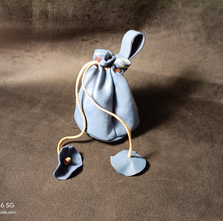 Handmade Blue Leather Drawstring Pouch – Simple, Sturdy, and Full of Character