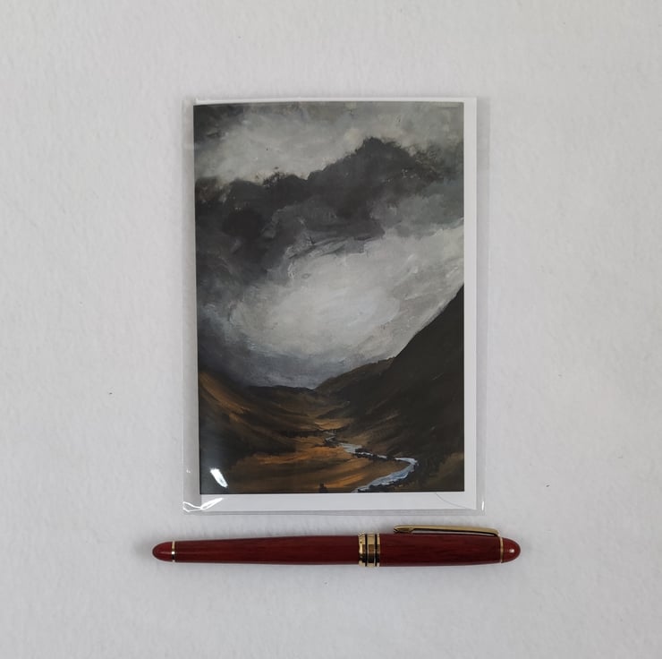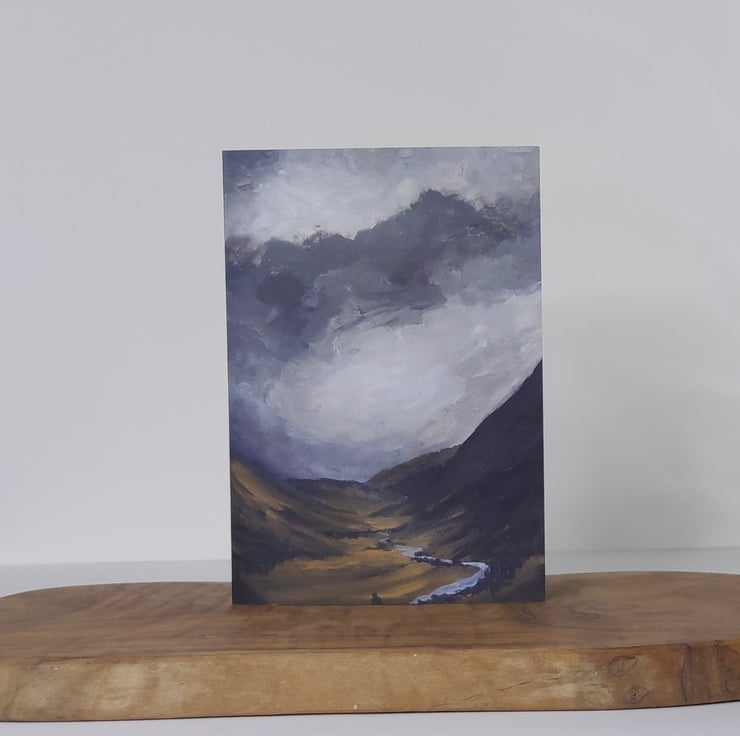 This blank greeting card is printed from an original painting I did called "River Valley". Inspired by a trip to the Cairngorms in October where I was fascinated in the the play of light across the hillside above the rive Tilt which was in full spate.This card is blank inside so suitable for any occasions or even framed as a little print.