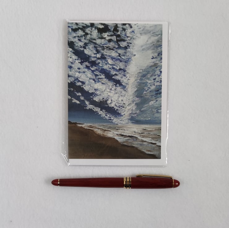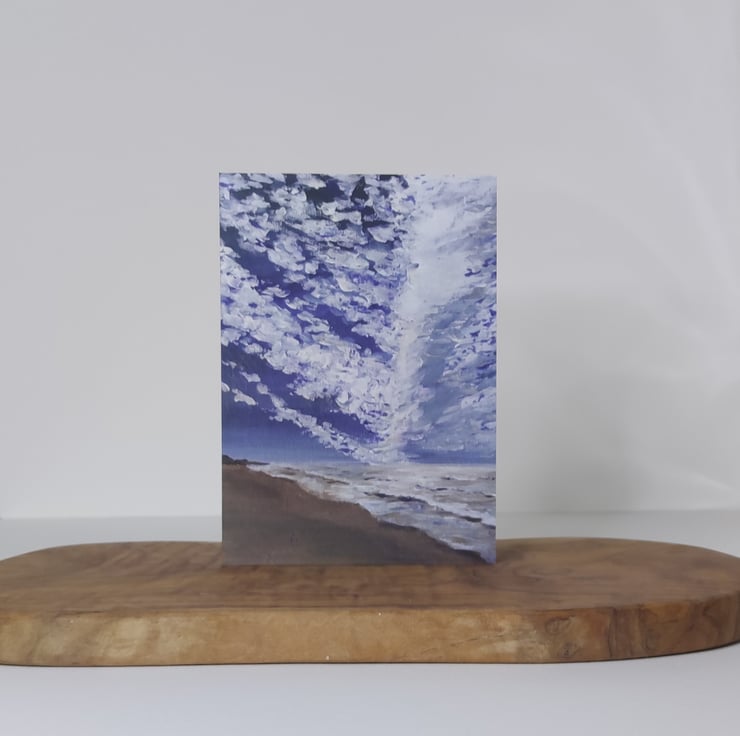 Printed from a original painting called "Dapple Skies" this little card is full of blue sky and summer brightness. Watching the cloud formations develop and dance above the sea is something I will never grow tired of I hope. This card is blank inside so suitable for any occasions or even framed as a little print.