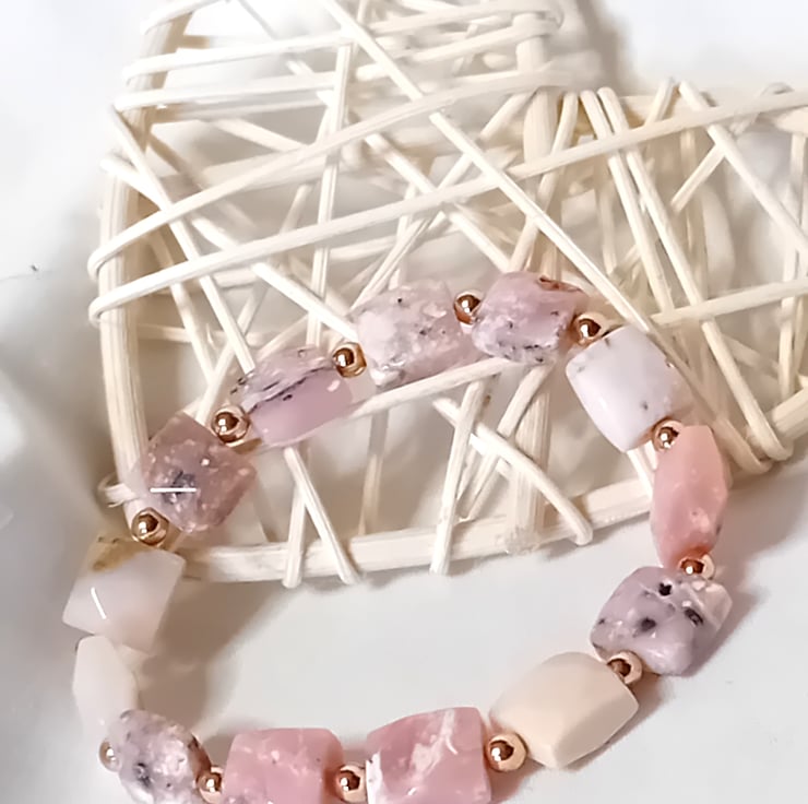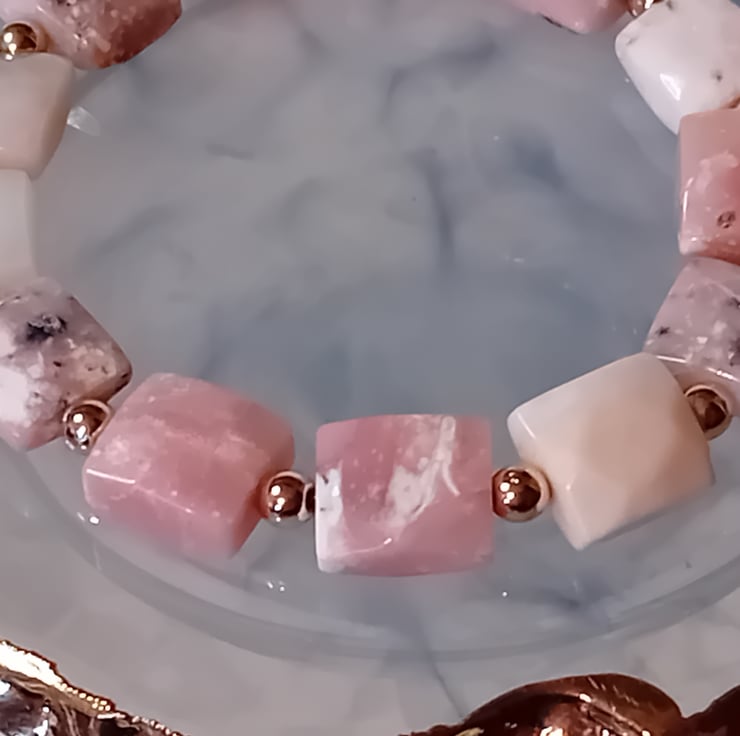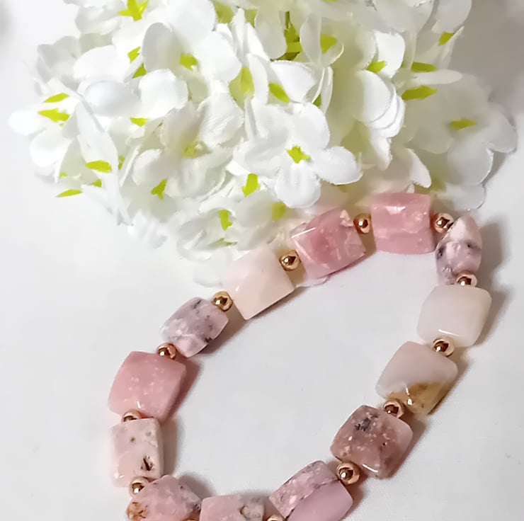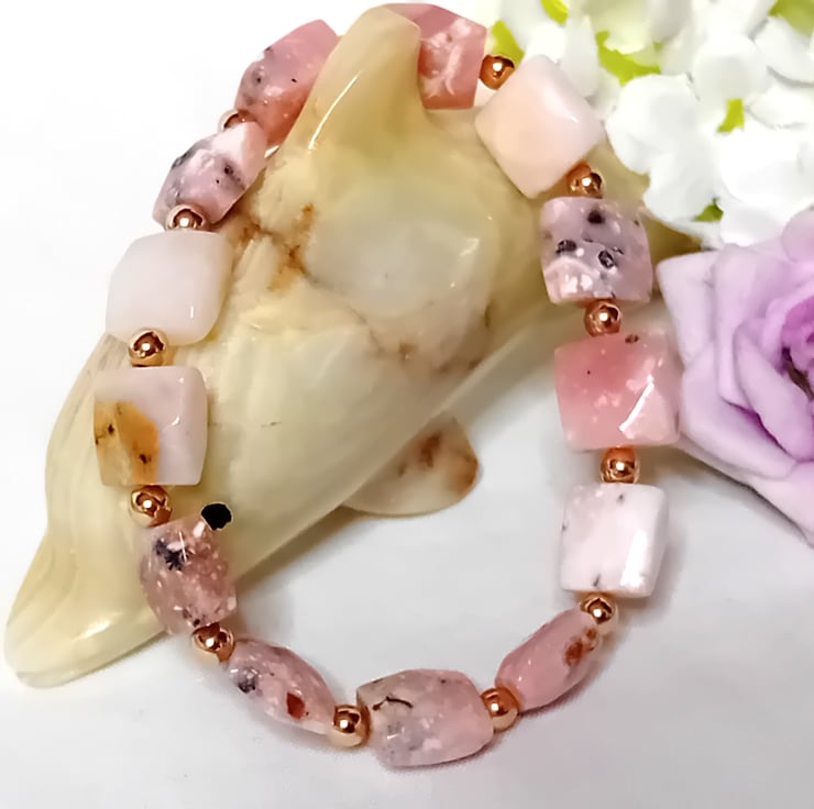This exquisite bracelet features natural, faceted Pin Opal semi-precious stones, each measuring approximately 10 x 10mm. The stones are beautifully accented with 3mm Gold Hematite beads, creating a harmonious blend of elegance and simplicity. With each stone uniquely distinct, this bracelet boasts a one-of-a-kind charm that makes it truly special.