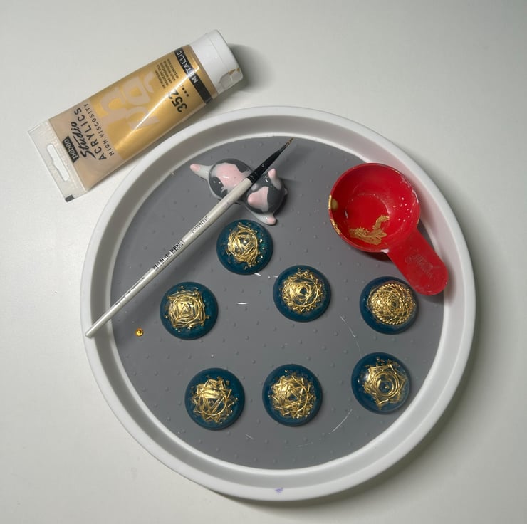 Materials: Eco resin, rose quartz, gold crushed glass, acrylic paint, pigment paste and of course, a pinch of love