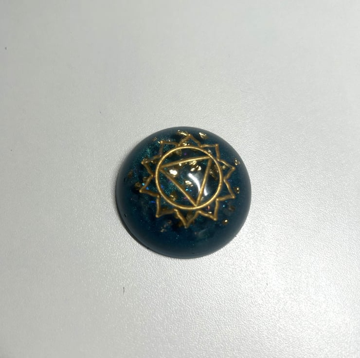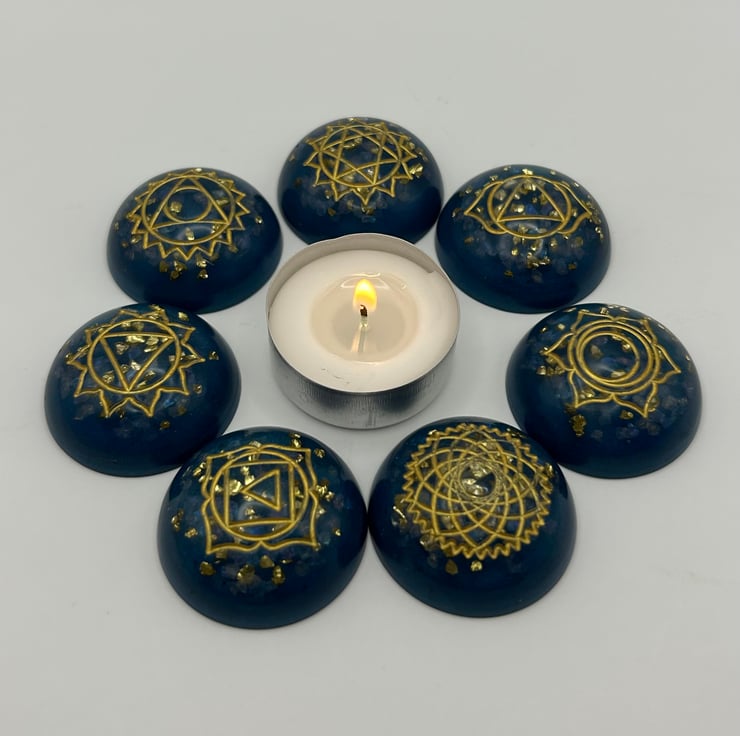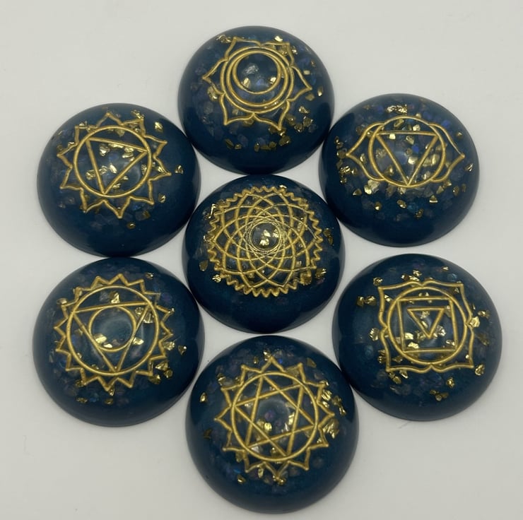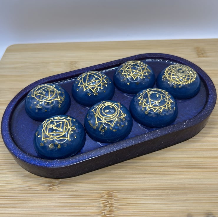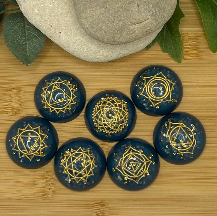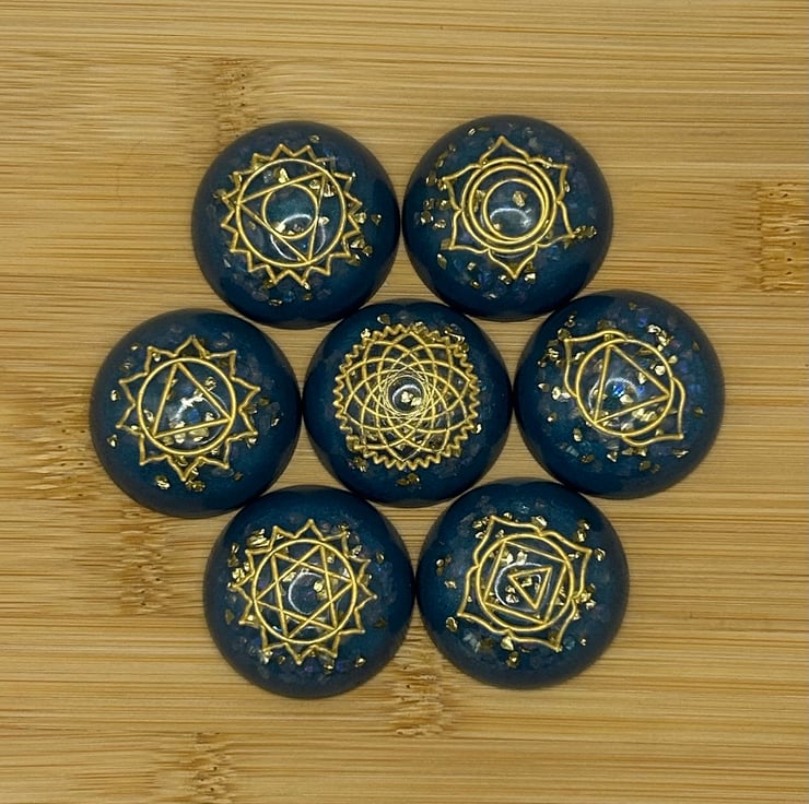 Bring calm, colour and intention to your space with this handmade set of seven chakra stones. Each piece is crafted in deep teal eco resin, with real rose quartz chips and golden glass flecks that shimmer softly in the light.