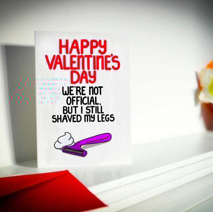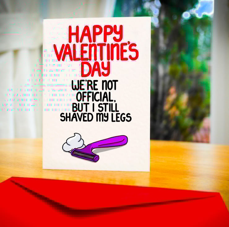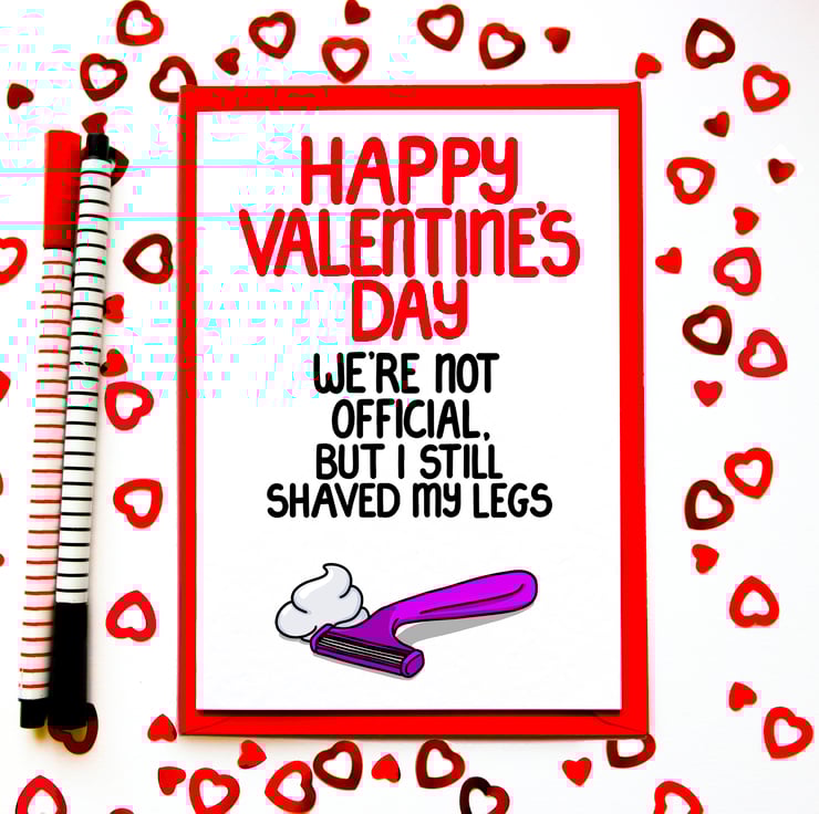 Greeting on front: HAPPY VALENTINE'S DAY WE'RE NOT OFFICIAL, BUT I'VE SHAVED MY LEGS