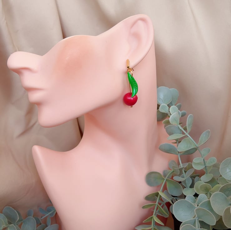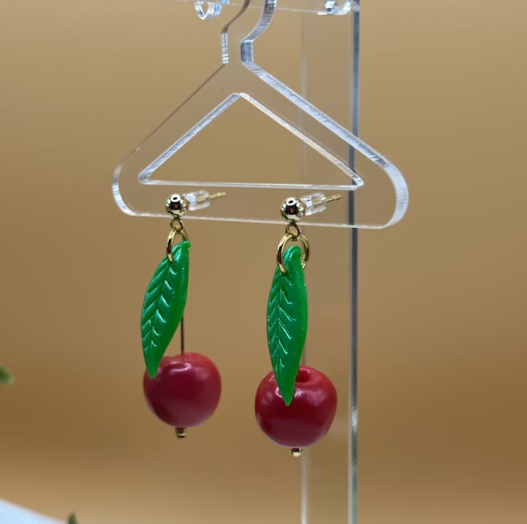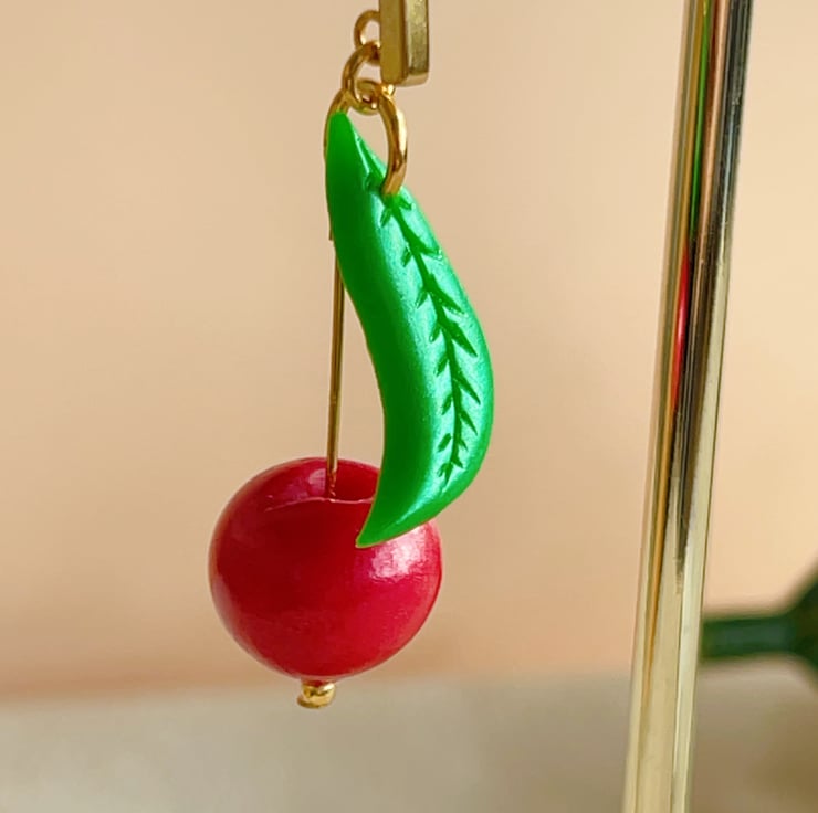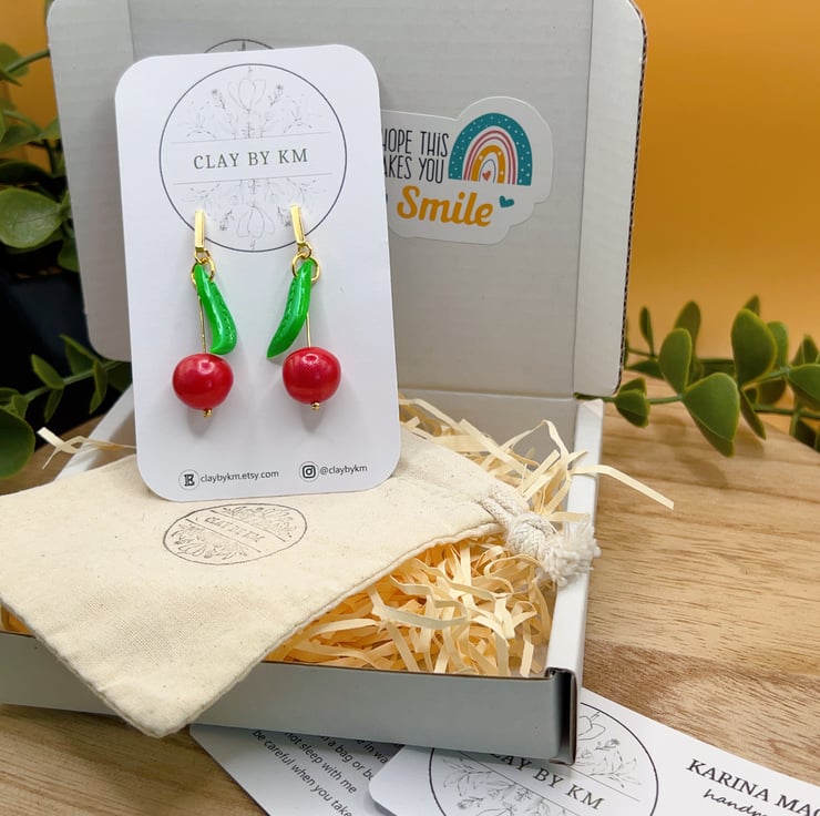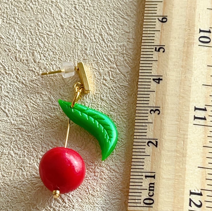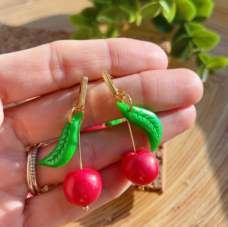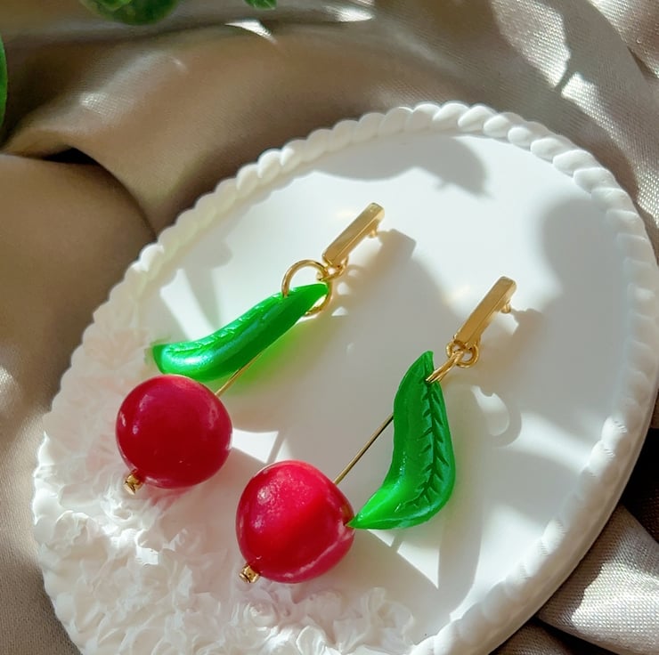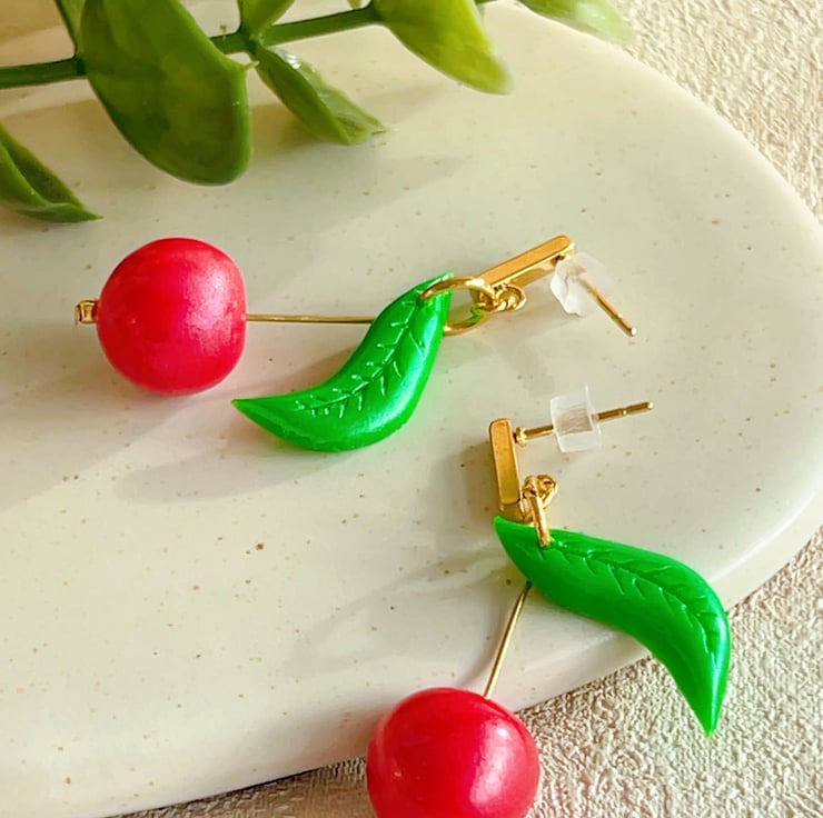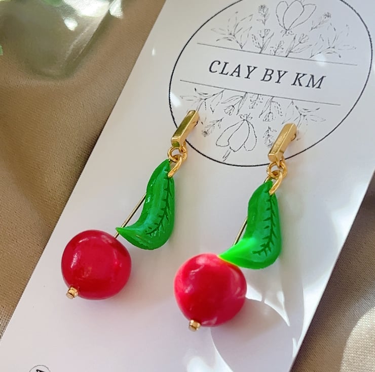 Handmade from polymer clay, they are lightweight and comfortable to wear. The glossy red cherry with a green leaf gives a fun, summery feel while still looking neat and stylish.