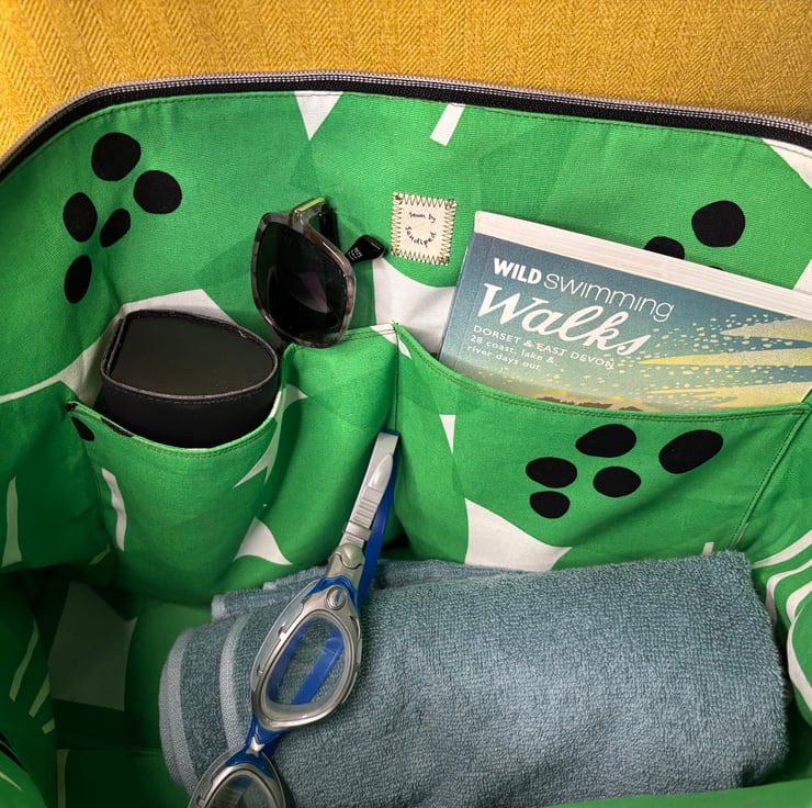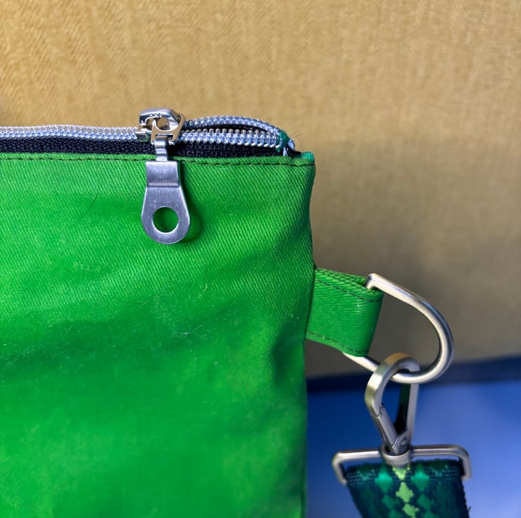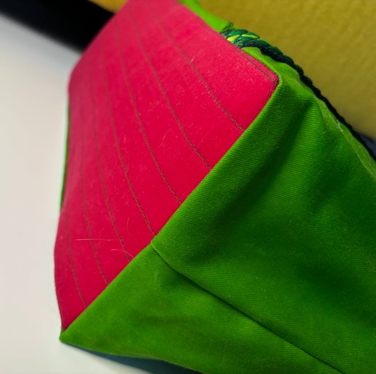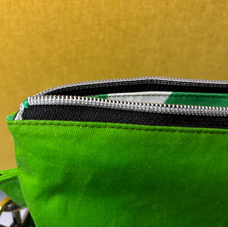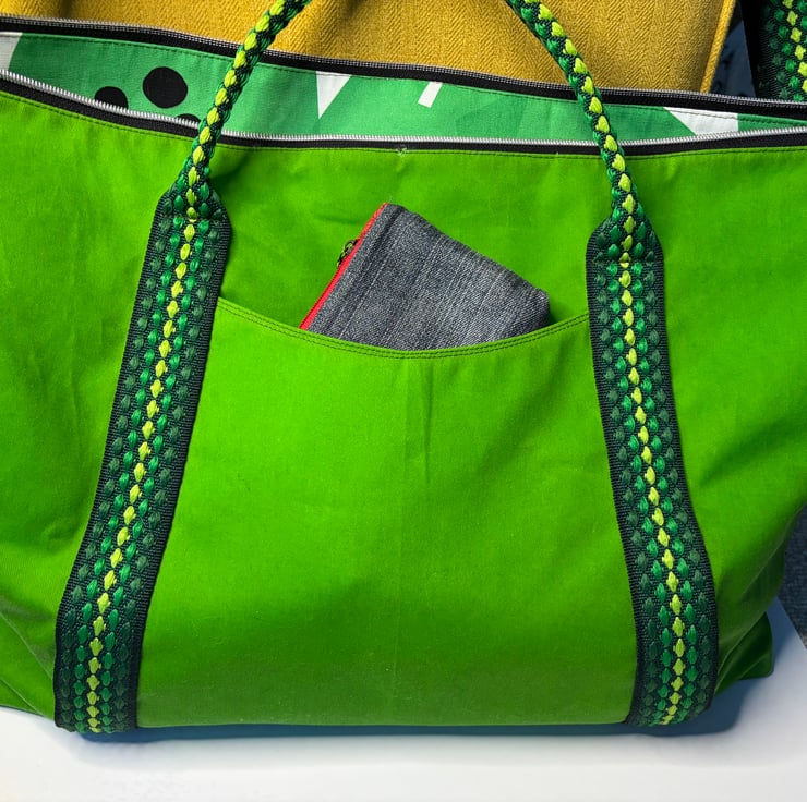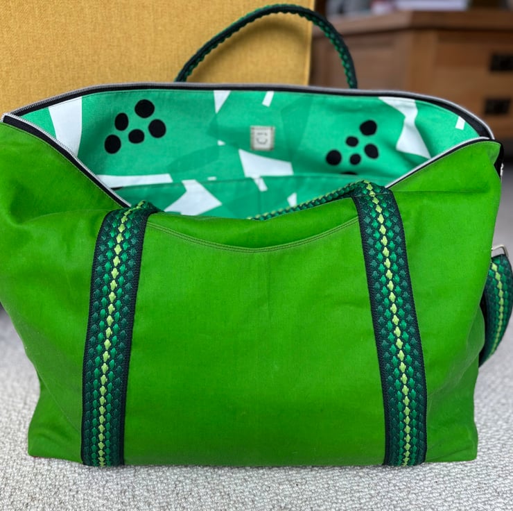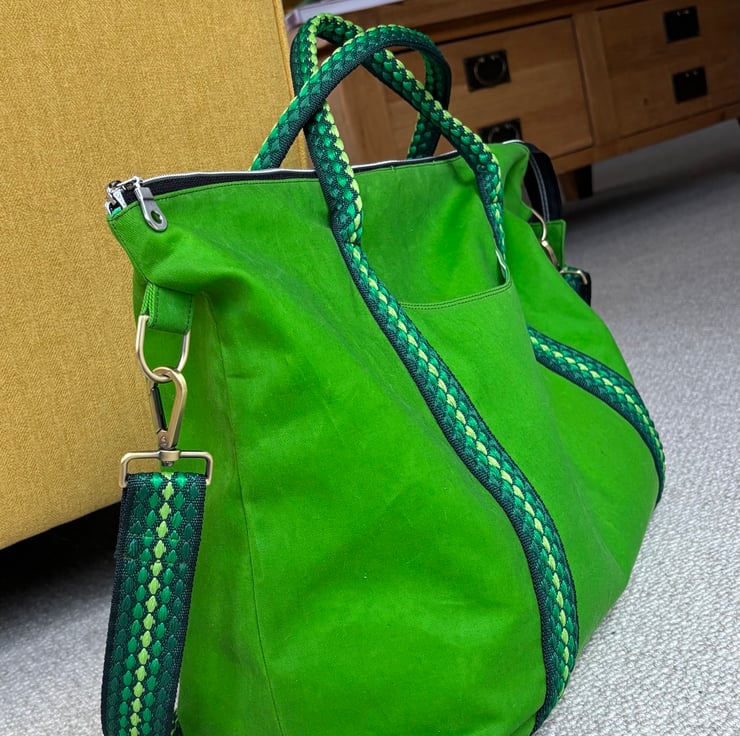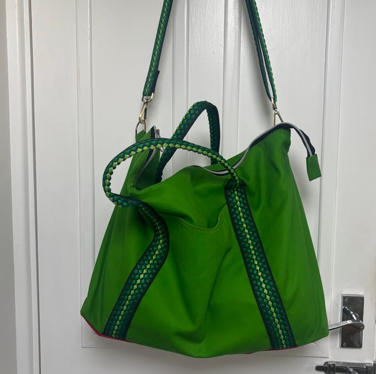 The outside is made from a vibrant green waxed canvas - which makes it water repellent. The base is also a water repellent and reinforced waxed canvas in a contrasting cerise. The inside is a strong green, white and black patterned canvas. The handles and crossbody strap are a polypropylene webbing in shades of green.