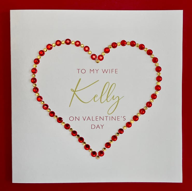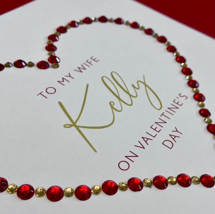 A hand-crafted personalised Valentine greetings card embellished with sparkly red and gold diamanté gems