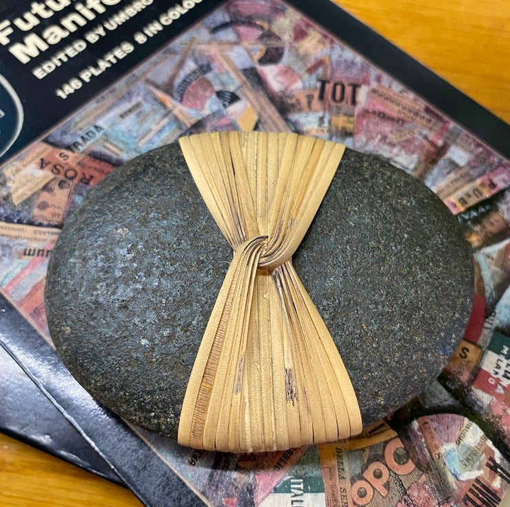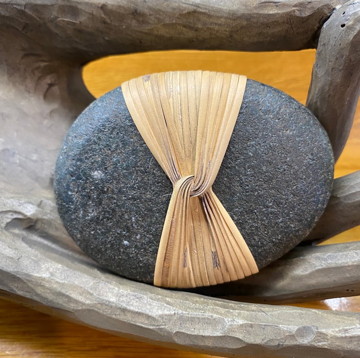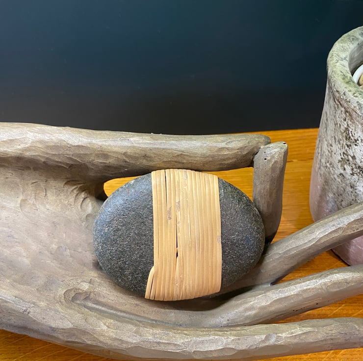 A hand wrapped stone following the Japanese method of Musubi. This means to tie, knot or connect, representing the binding of people, time or spirit. It is also considered as the creative, generative power of the universe, and central to concepts of destiny.
