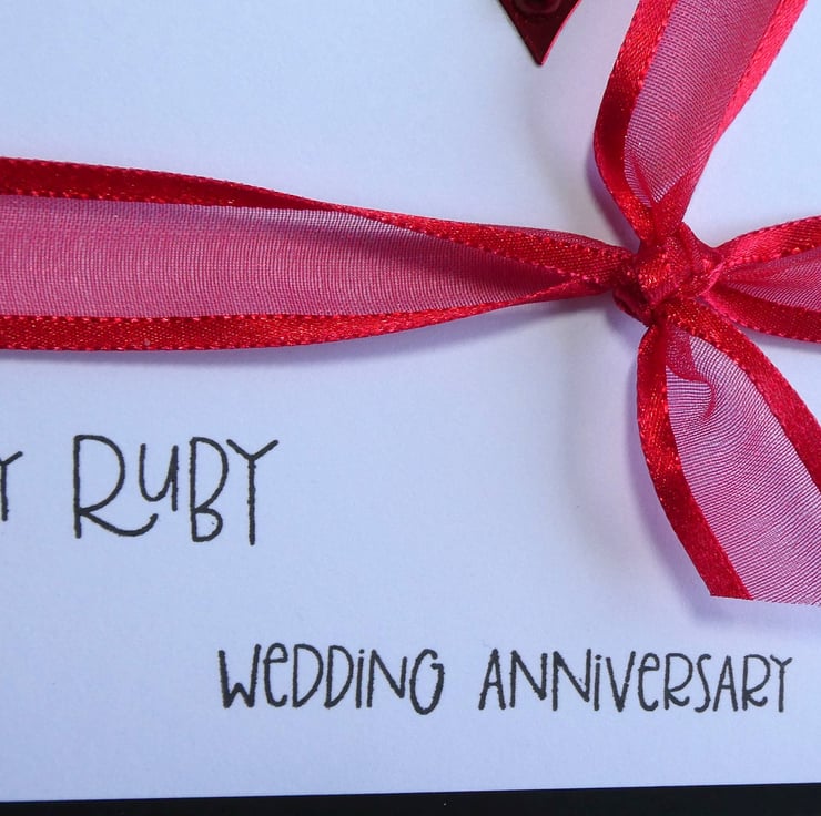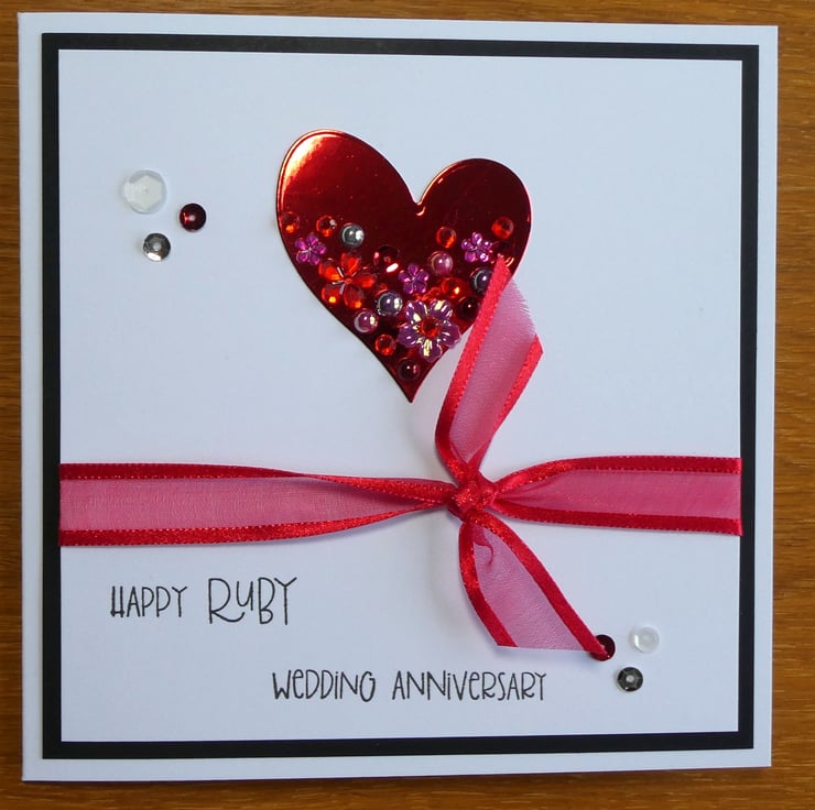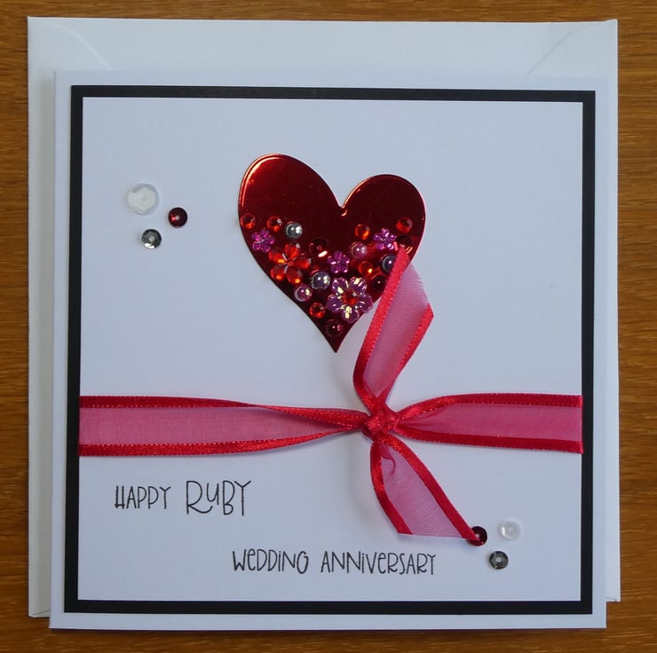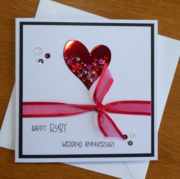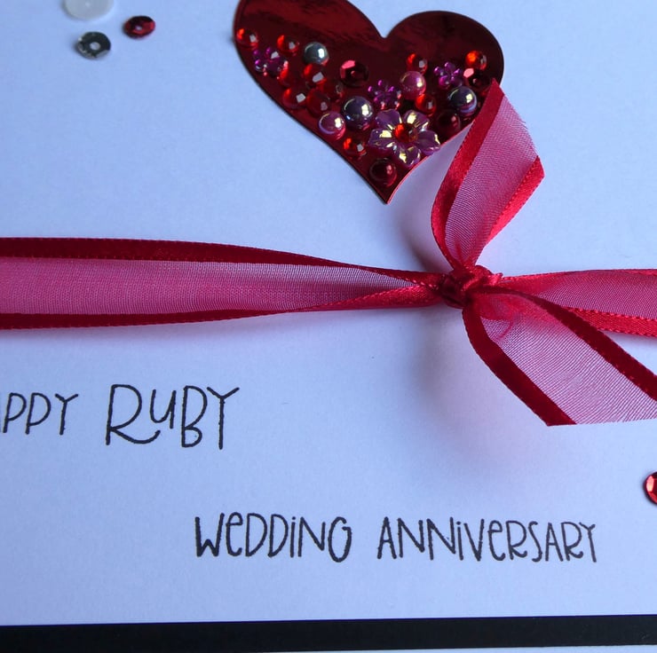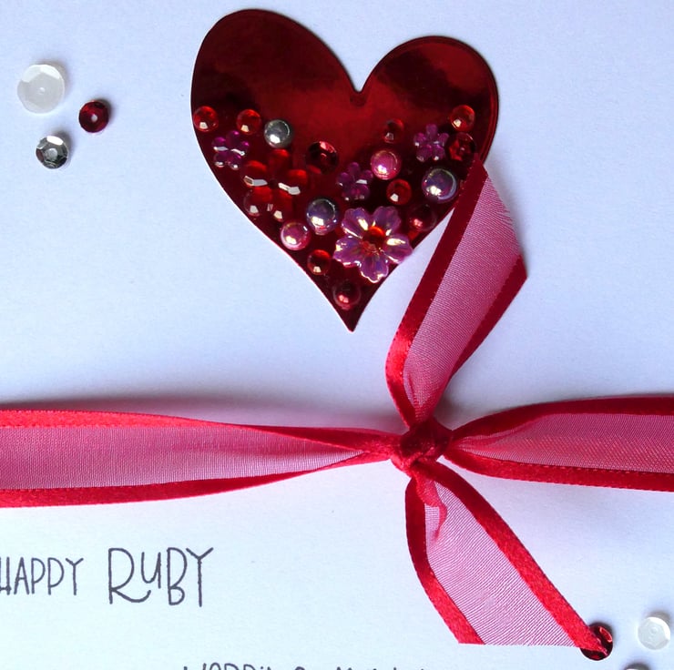 This elegant Ruby Wedding Anniversary card with a red, white and silver theme has a ruby red embellished heart and ribbon and is perfect to send to someone celebrating their 40th Wedding Anniversary.
