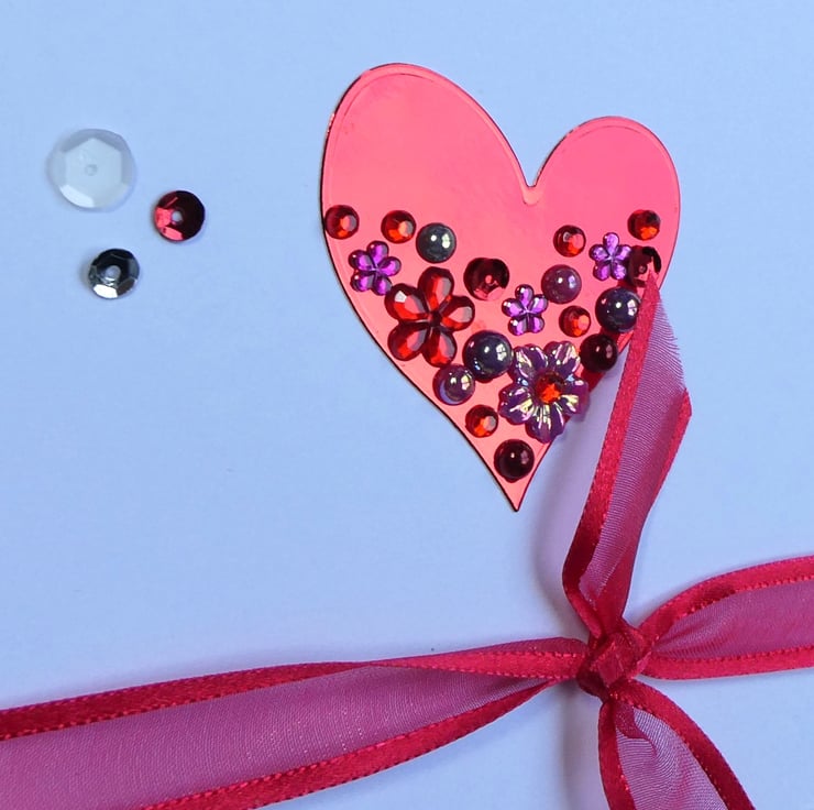 A ruby red foiled heart has been die cut and embellished with sequins, faux pearls and flower beads in shades of red, silver and pink. It has been attached to bright white background card above a band of red organza ribbon which has been tied in a knot.