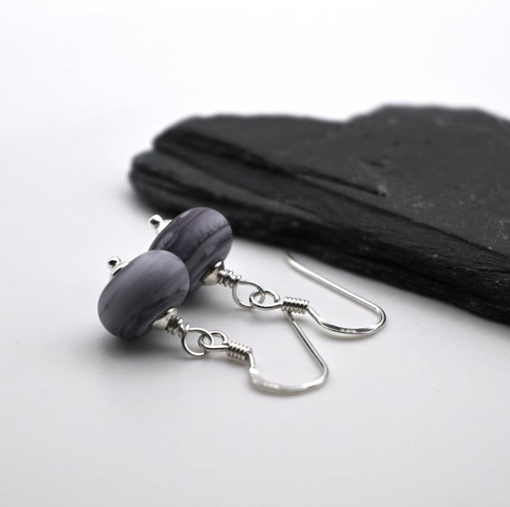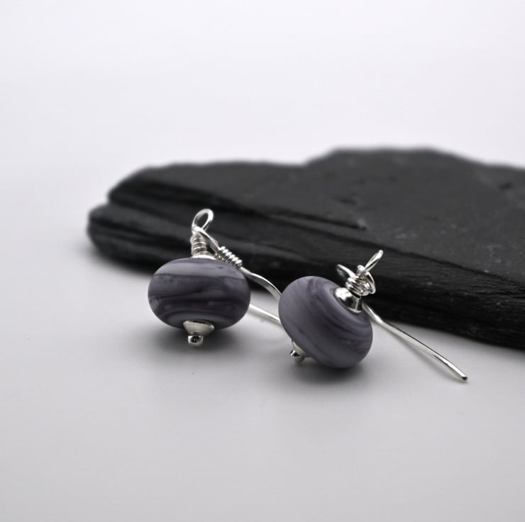 A pair of sterling silver earrings which feature handmade lampwork glass purple beads.