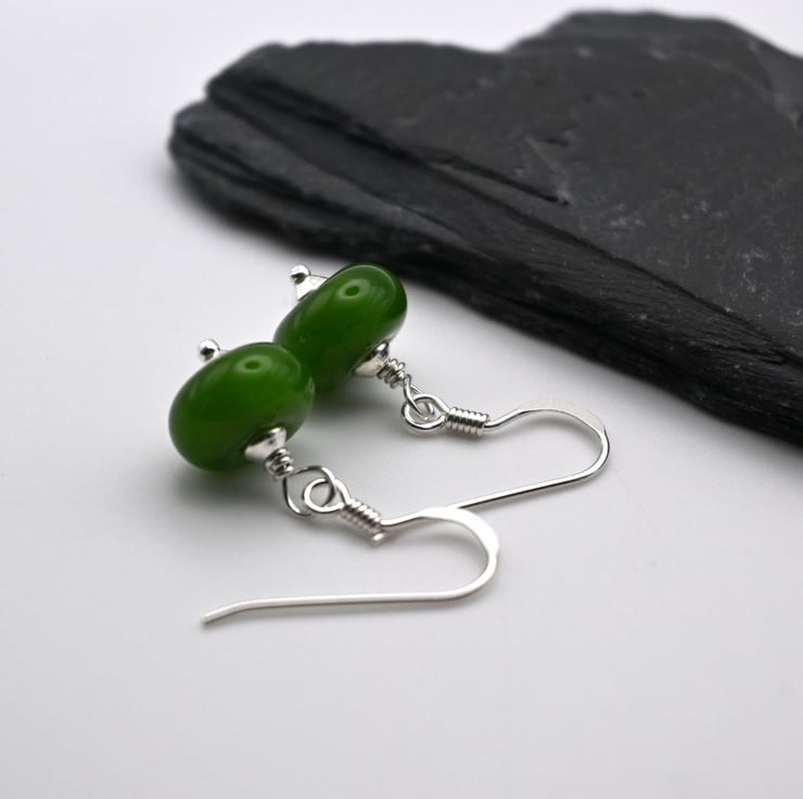 A pair of sterling silver earrings which feature handmade lampwork glass green beads.