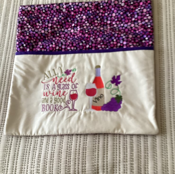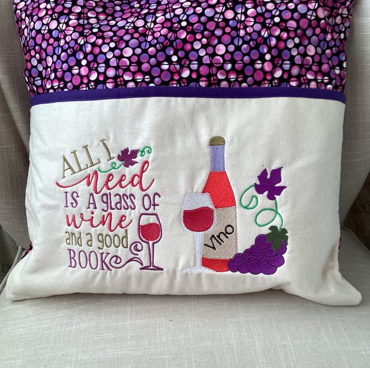 This wine cushion cover has a pocket for a book with the words