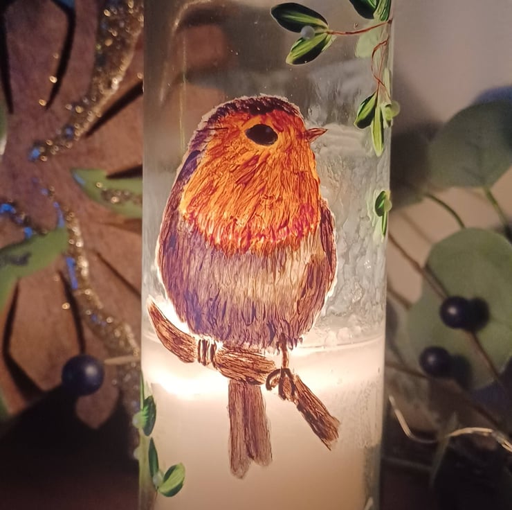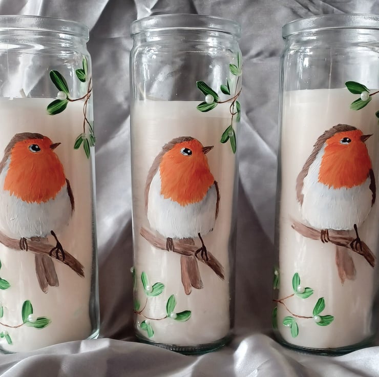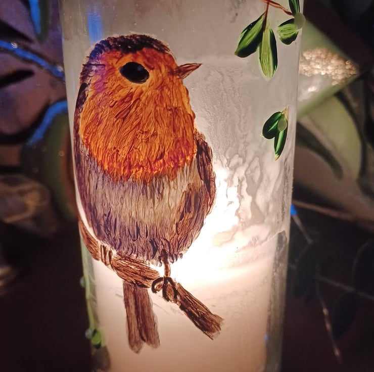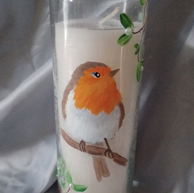 These pretty tall candles have a glass casing which have been lovingly hand painted with a robin and mistletoe, using high quality enamel paints and finished with decorative pearls.