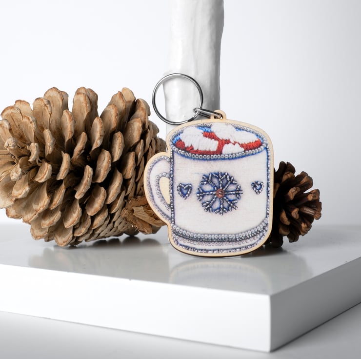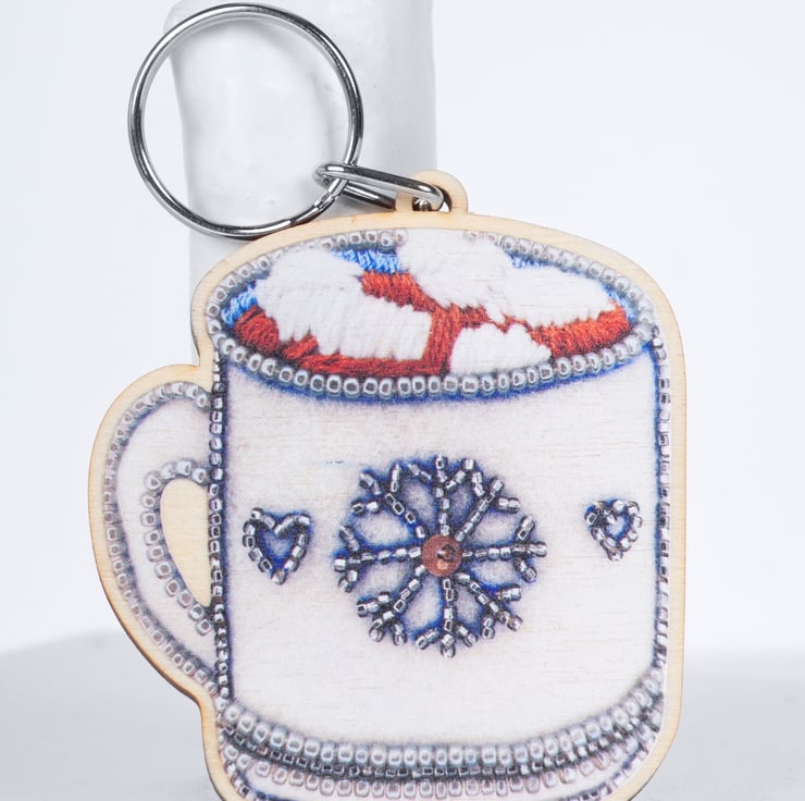 This cosy wooden keyring features a sweet hot chocolate illustration, adapted from my original artwork and designed to add a little warmth to everyday life. The design shows a white mug decorated with hearts and a snowflake, filled with rich hot chocolate and topped with deliciously fluffy marshmallows. It is a lovely small gift for anyone who adores hot chocolate, wintertime comforts or cheerful, feel-good accessories.