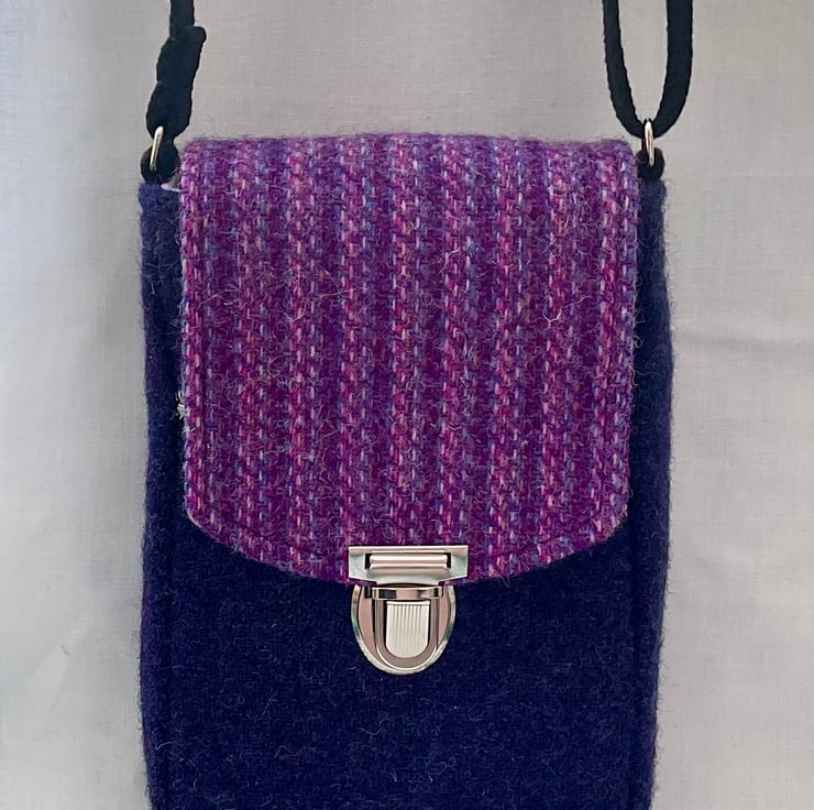 Handcrafted in 100% pure new wool Harris Tweed fabric in deep purple with a contrasting Kona stripe tweed flap with a tuck lock closure and sewn on authenticity label