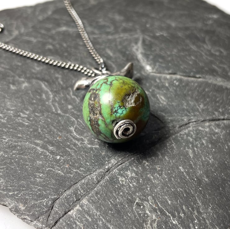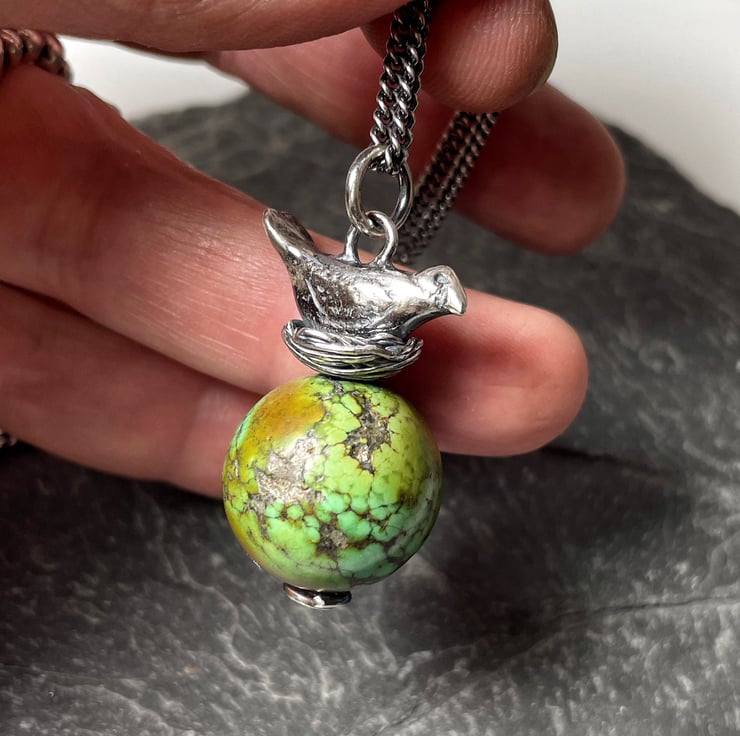 A large pendant, with a silver bird on her nest on top of a large weathered turquoise bead.