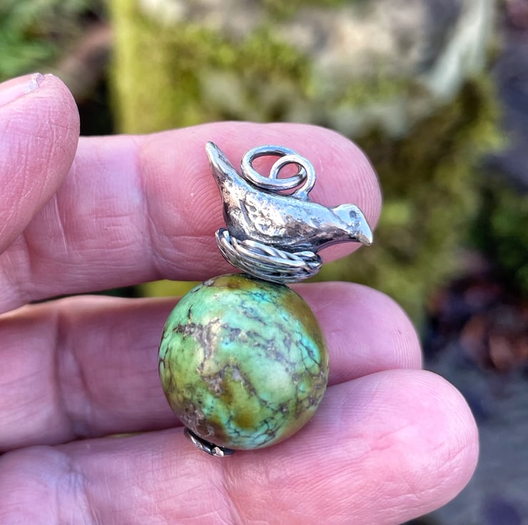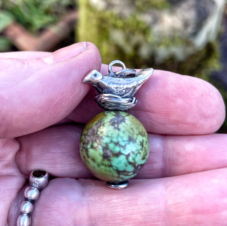 A carved silver bird sits atop a wire woven nest, these sit on top of a large earthy, weathered, vintage turquoise bead, that puts me in mind of the globe.
