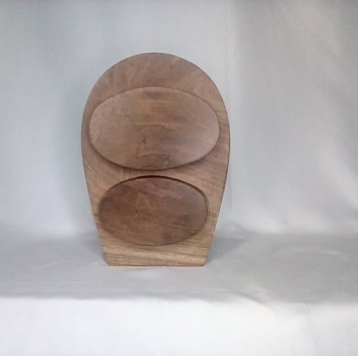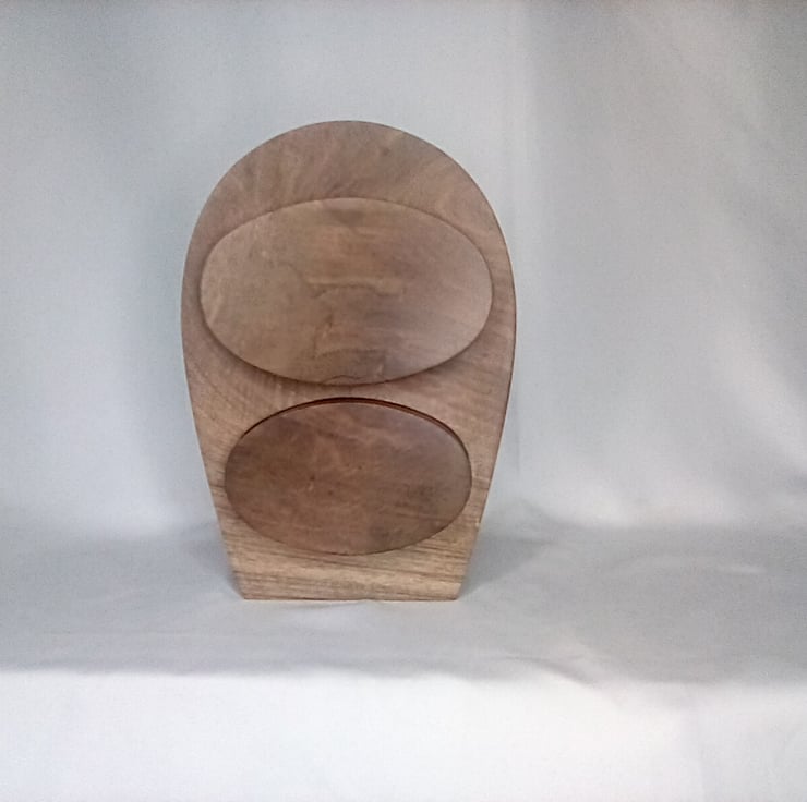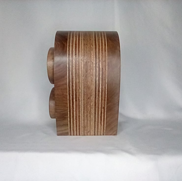 Bespoke hand made wooden elliptical walnut and hardwood ply two drawer box reflecting art nouveau culture showcasing a intricate design and shape with its protruding drawer fronts bringing out the beauty of the craftsmanship finished in a natural wax to enhance the beauty of the grain standing 22.5cm high 15cm wide and 14cm deep