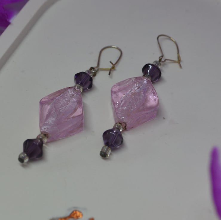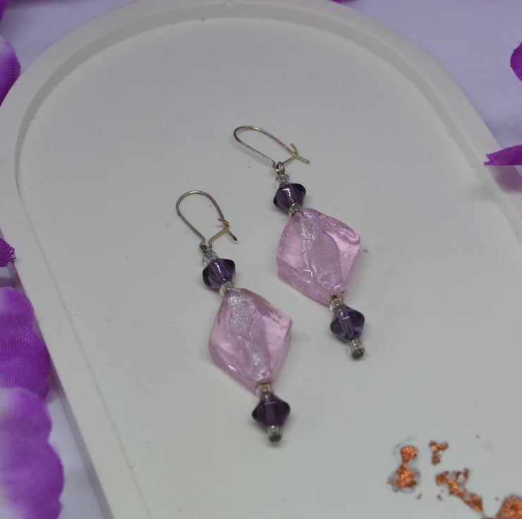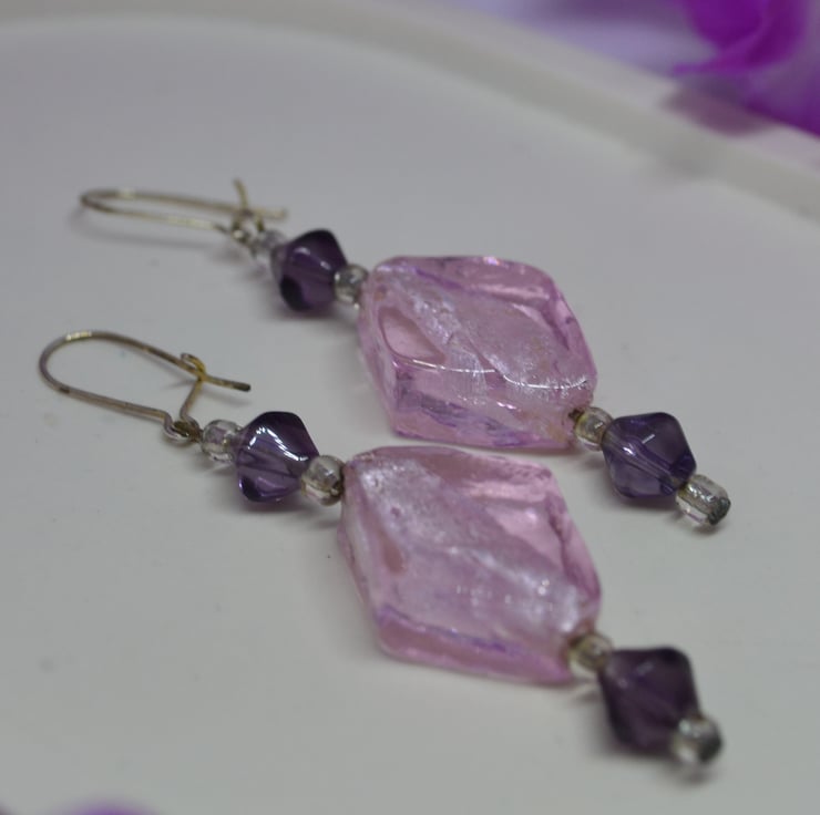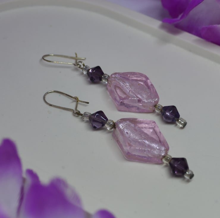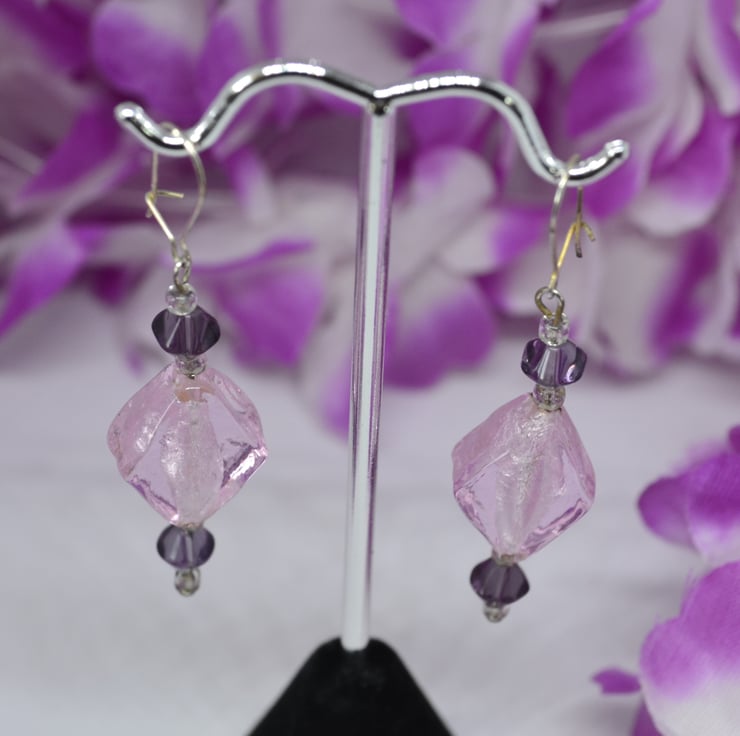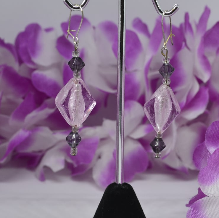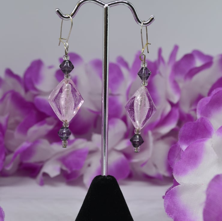 If you love geometric shapes, then these earrings are for you. With transparent silver lined glass diamonds and purple glass bicone beads, those that love "straight edges" will find them a lovely accessory to their wardrobe. The "kidney" ear wires clip shut at the back, perfect for those that like a little added security to stop earrings getting lost. They are silver plated, but can be changed to "fish hook" style alternatives for those with allergies or personal preference.