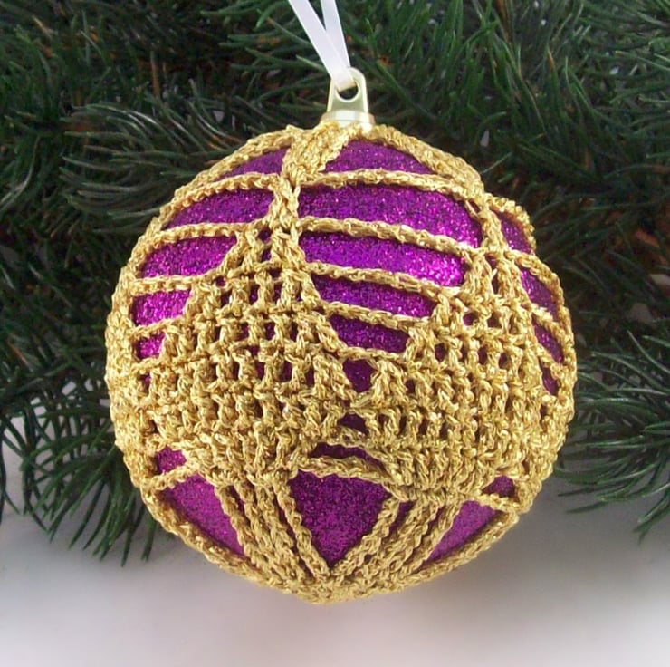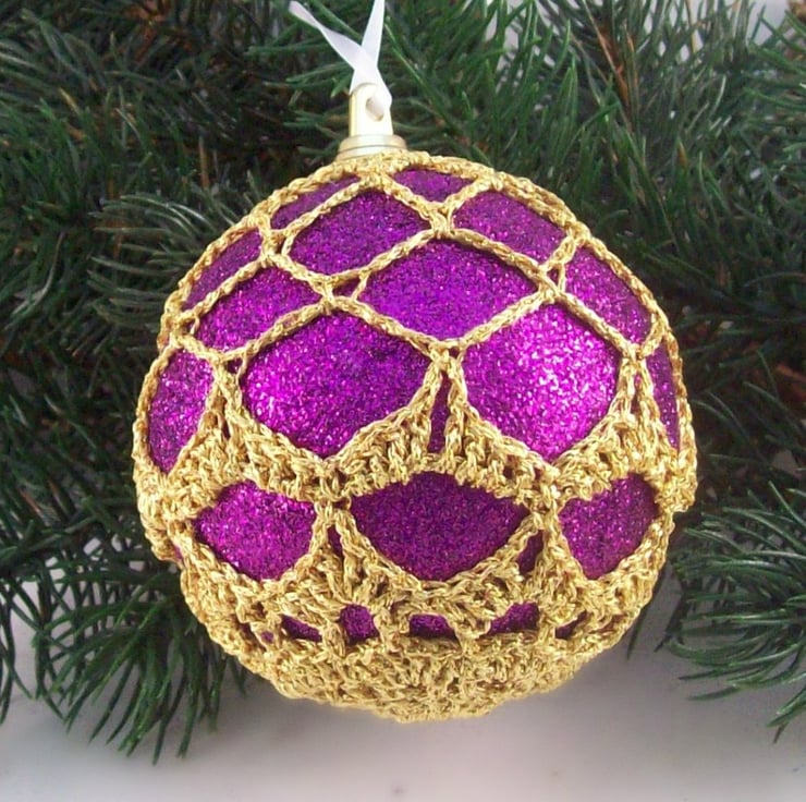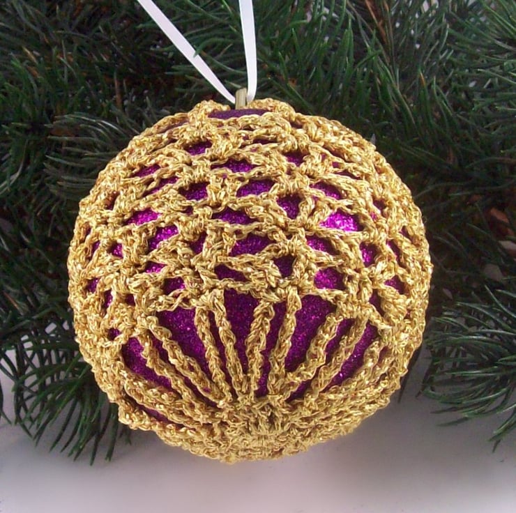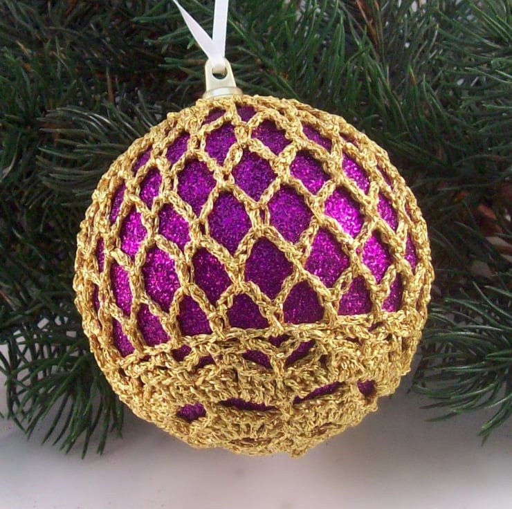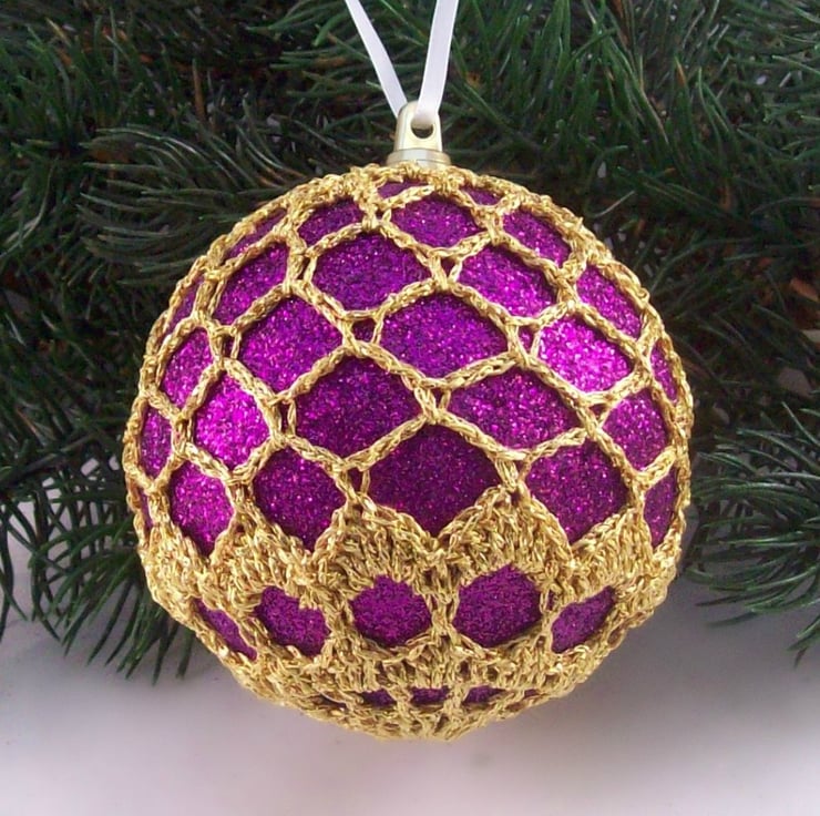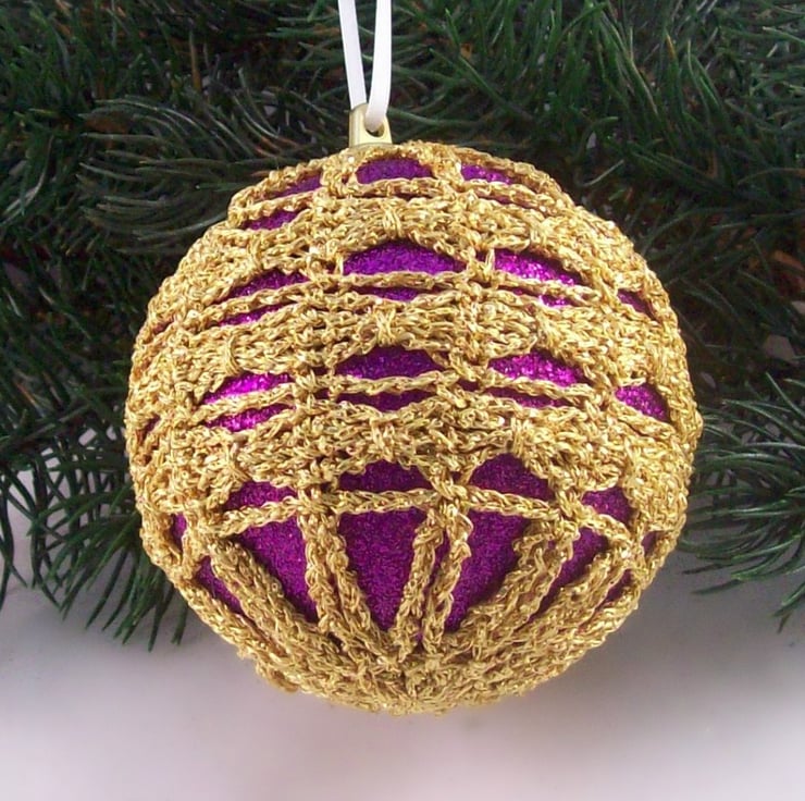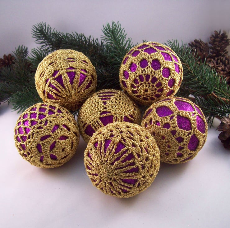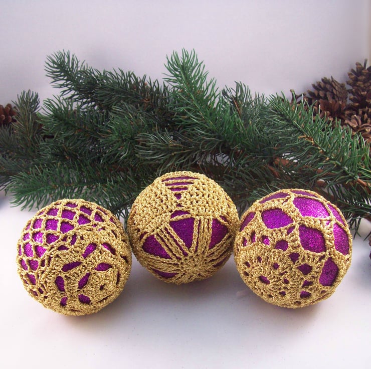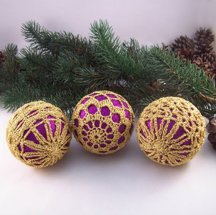 Discover the charm of this unique set of exquisite glittery purple baubles, beautifully enhanced with hand-crocheted lace in a gold colour of sparkly Twilleys Goldfingering—an enchanting addition to your Christmas tree!