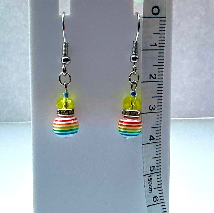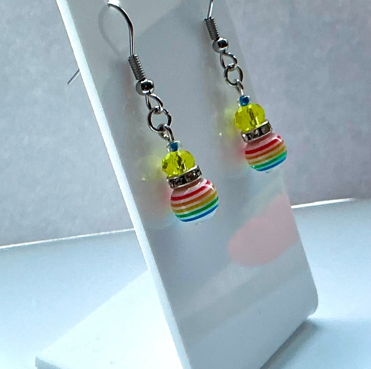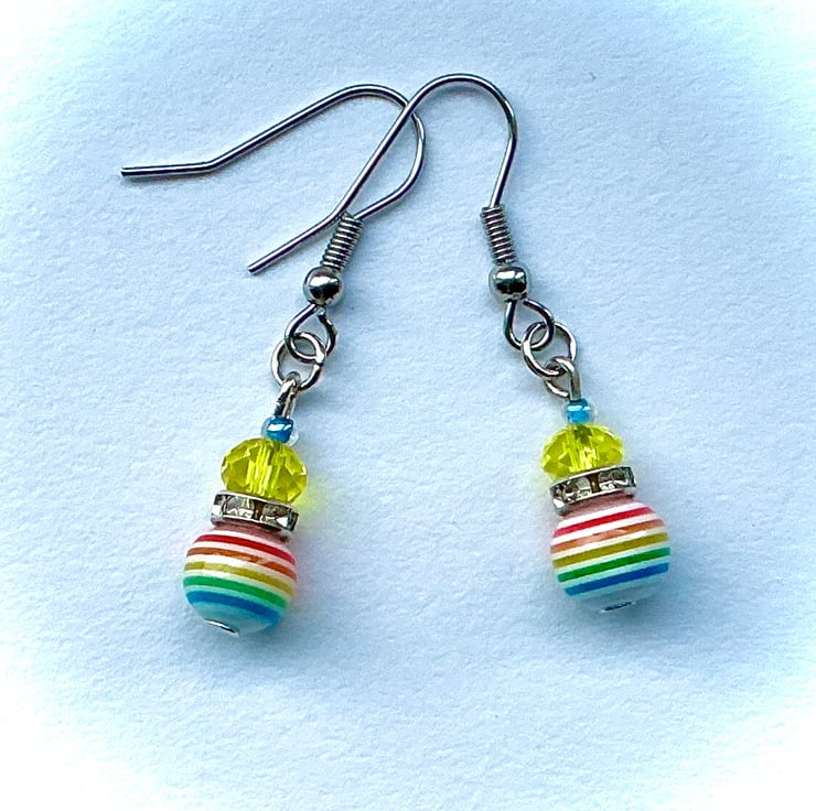 Multicoloured striped beads feature in this short drop pair of earrings adding a fabulous splash of colour to any outfit. With the addition of bright Yellow faceted glass beads and sparkly rhinestone spacers to finish off. On stainless steel ear wires.