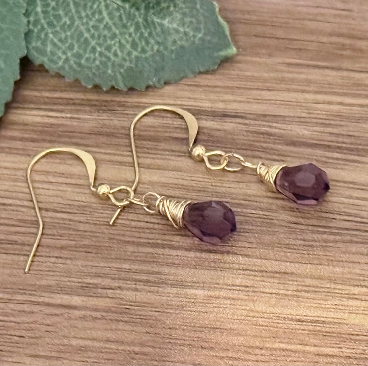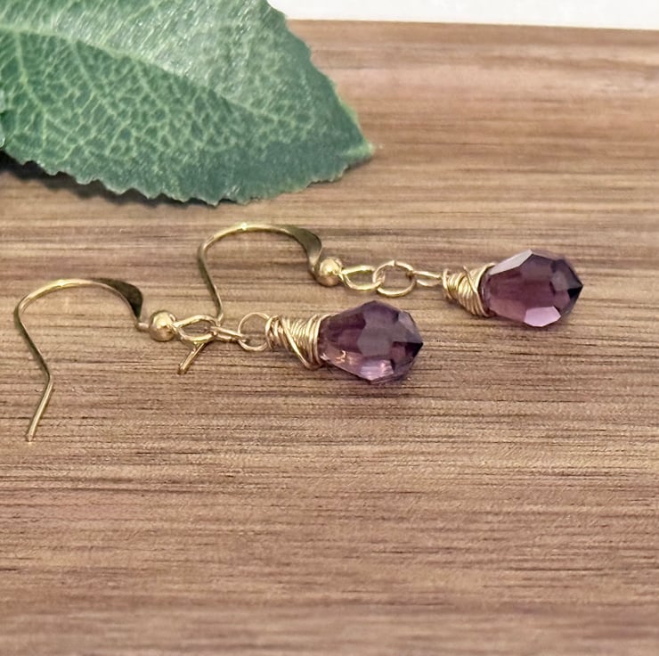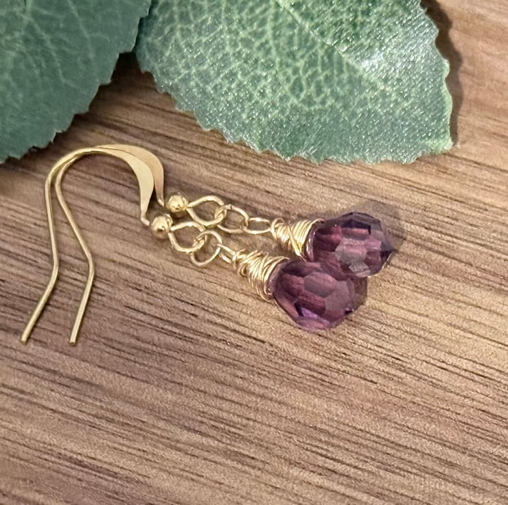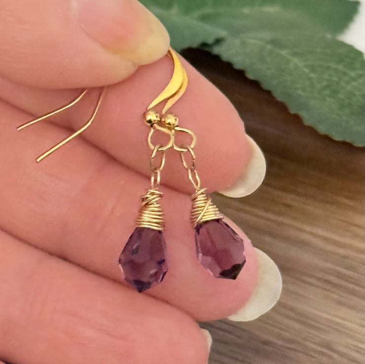 These sparkly, delicate earrings feature fire-polished Czech glass teardrop beads in a rich amethyst hue with a faceted finish. They’re wire-wrapped with gold-plated copper and hang gracefully from matching ear wires, with a drop length of 3.5 cm.