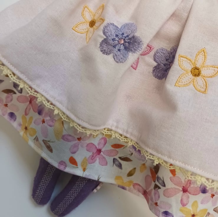 She wears a floral dress with pale pink pinafore, decorated with embroidered flowers and delicate lace trim, plus sweet purple stitched shoes. All clothing is removable. Perfect as a keepsake gift or a gentle companion for silent support.