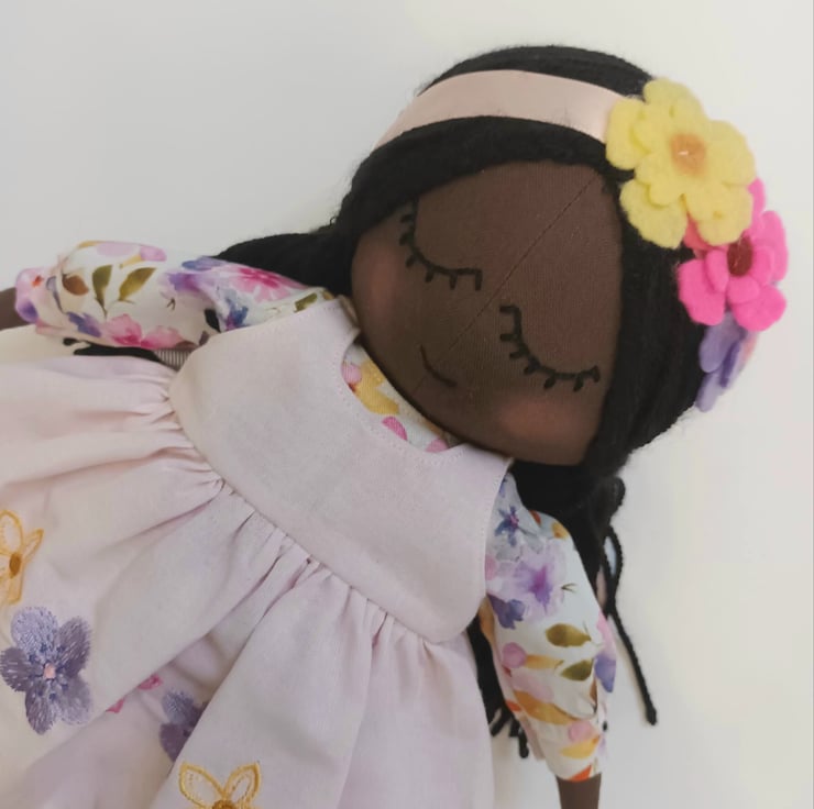 Meet Hattie, a beautifully handcrafted rag doll made with love and attention to detail. She features a soft deep-brown fabric complexion, embroidered closed eyes, rosy cheeks, and a gentle stitched smile. Hattie's long black woollen hair is finished with a pastel ribbon headband with felt flowers.