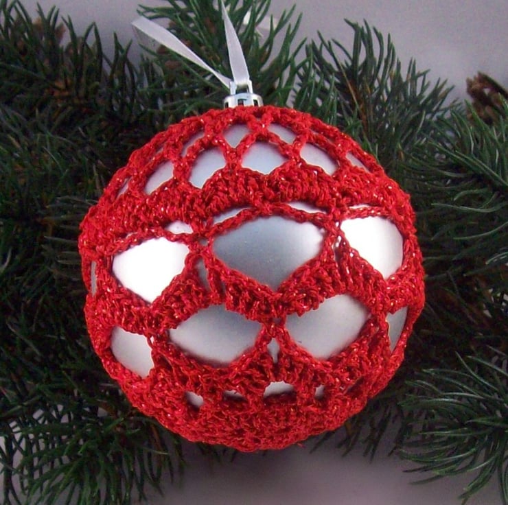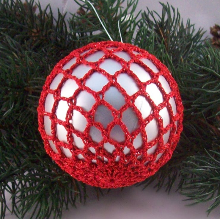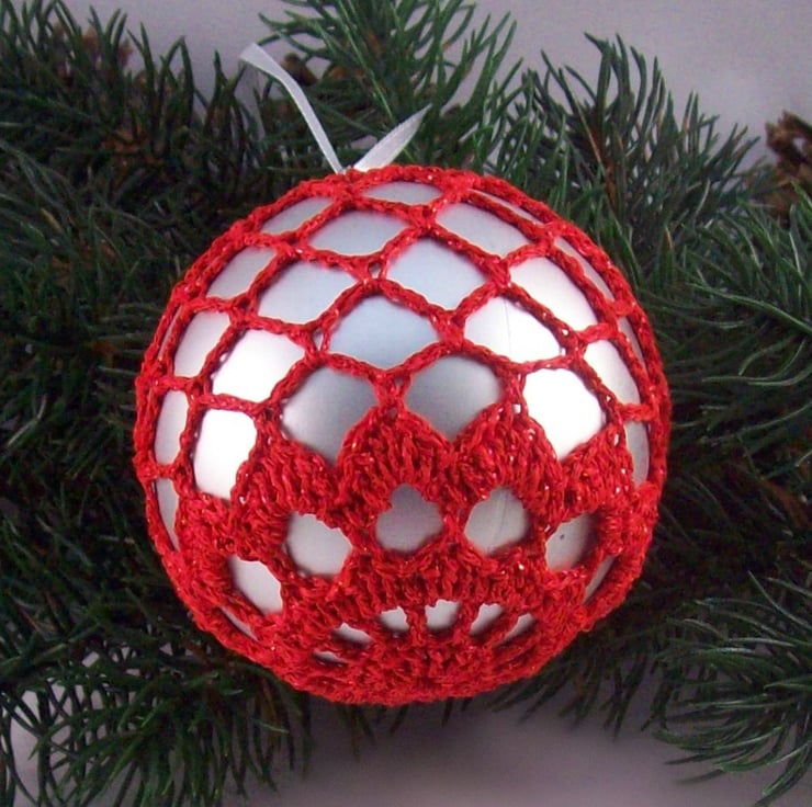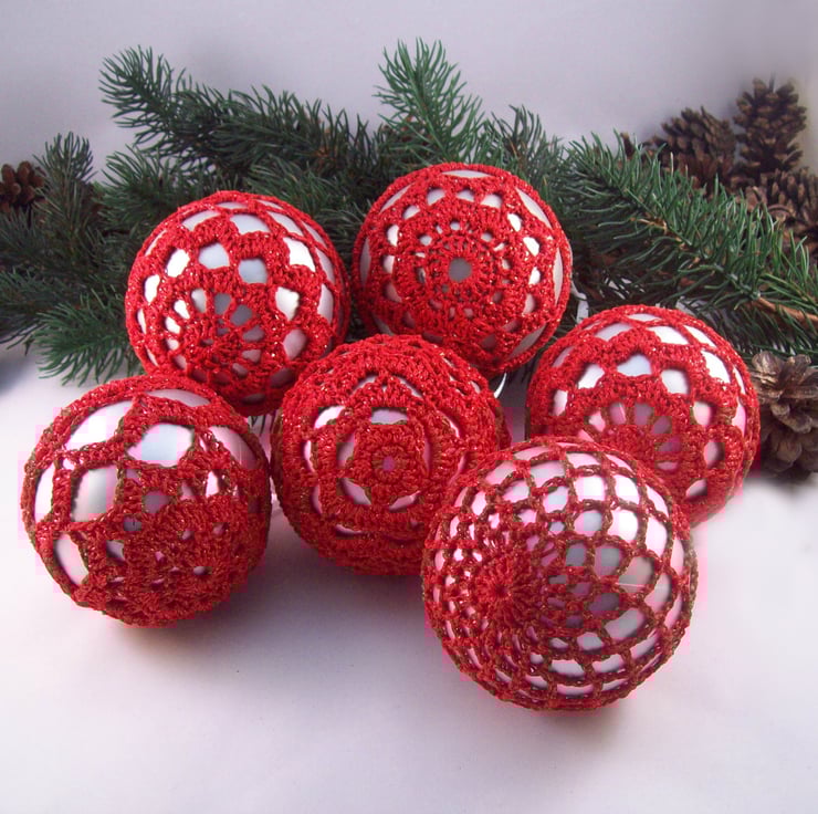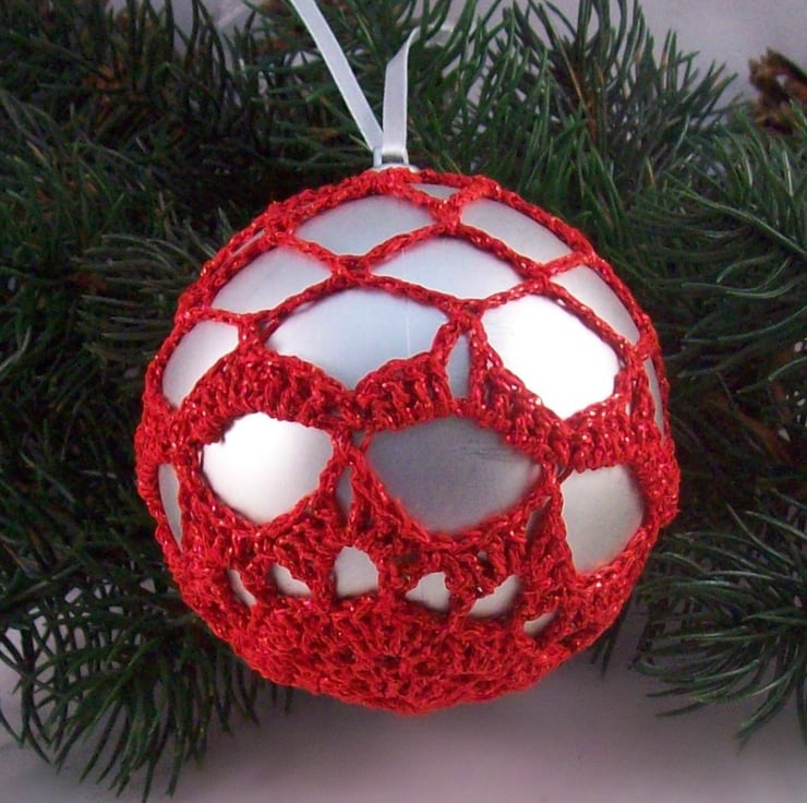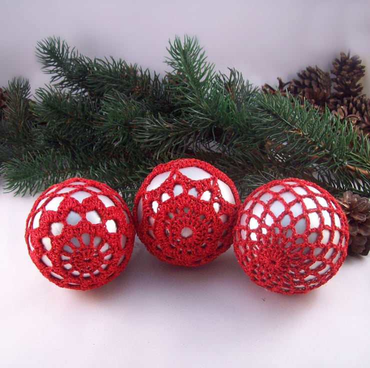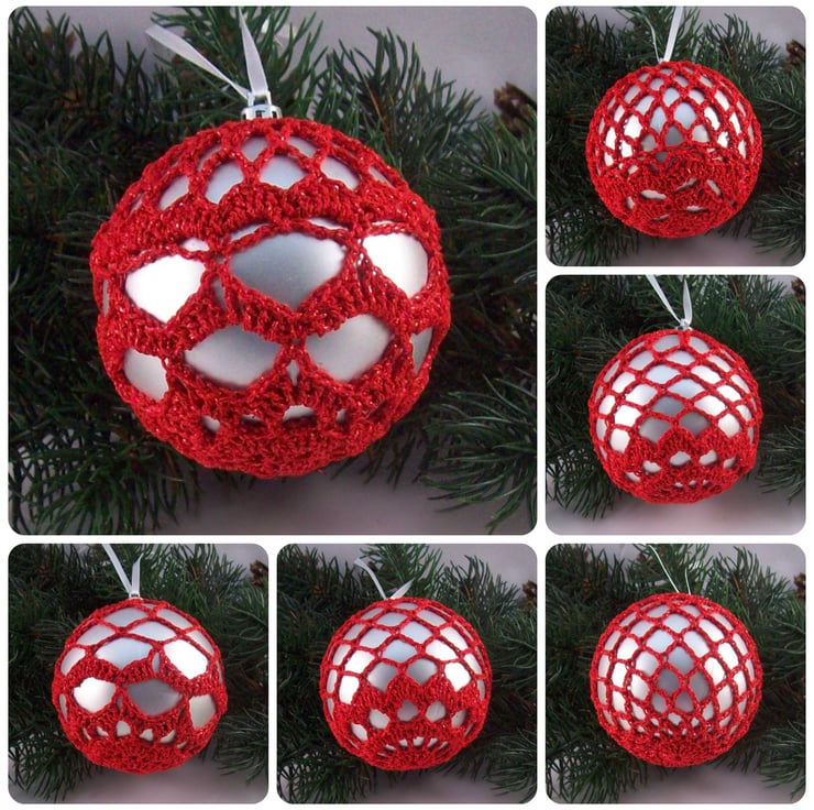 Discover the charm of this unique set of exquisite silver baubles, beautifully enhanced with hand-crocheted lace in a bright red colour of sparkly Twilleys Goldfingering—an enchanting addition to your Christmas tree!
