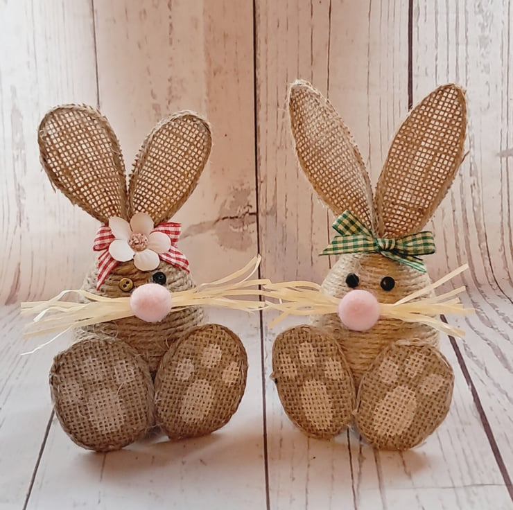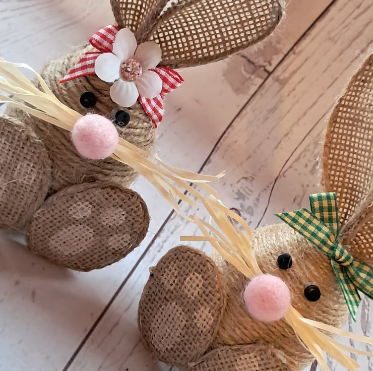 Cute handmade Easter bunnies. These little freestanding rabbits are lovingly made by me and have a little pink nose and a white fluffy tail.