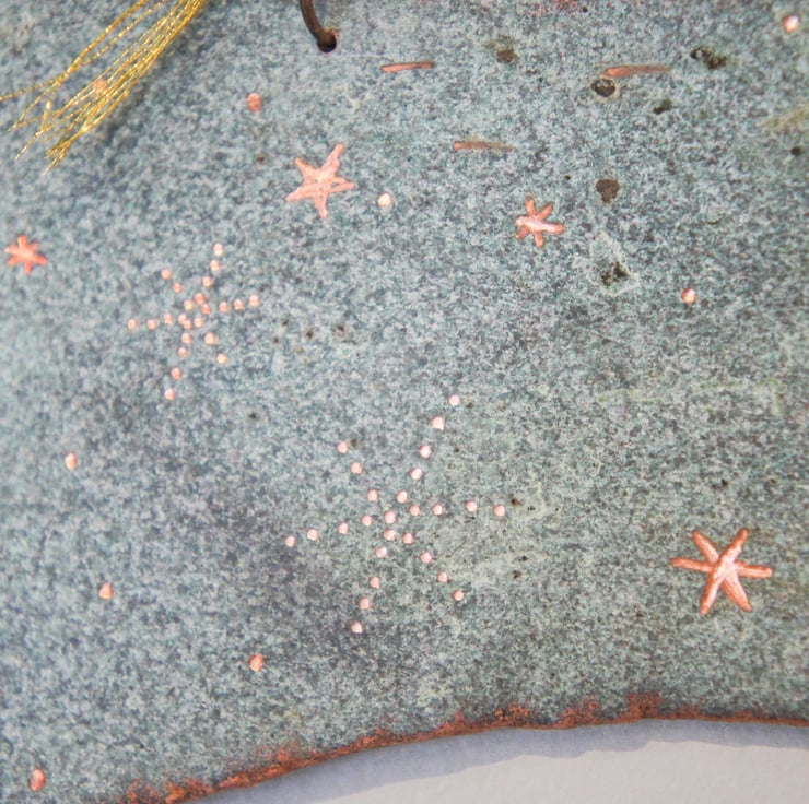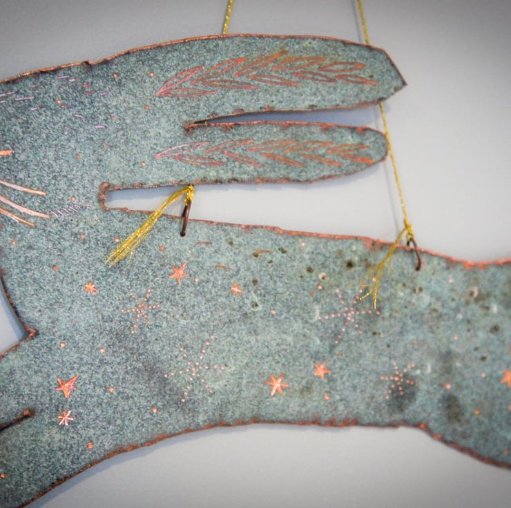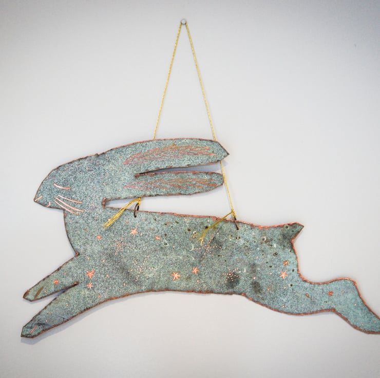 A handmade/ handcut one of a kind patina copper hare. Carefully hand engraved star detail.