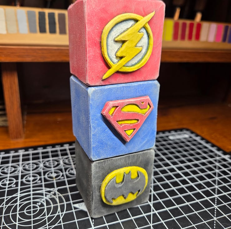 These carvings were made purely from my interest in superhero characters and specifically DC comics in which most of my favourite superhero characters are from. I have carved a few superheros in the past so I thought the idea of just carving their badge symbols into blocks would look pretty cool.