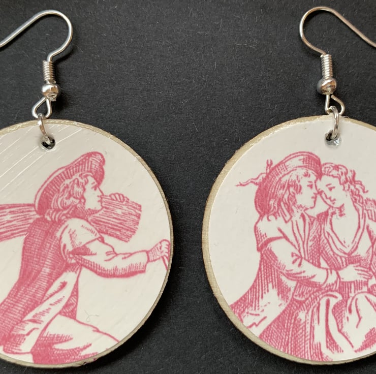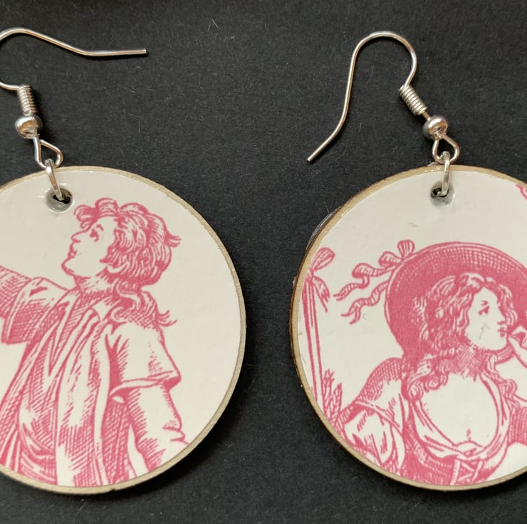 This pair features people / figures in 4 positions. The Earring hooks are silver coloured metal.