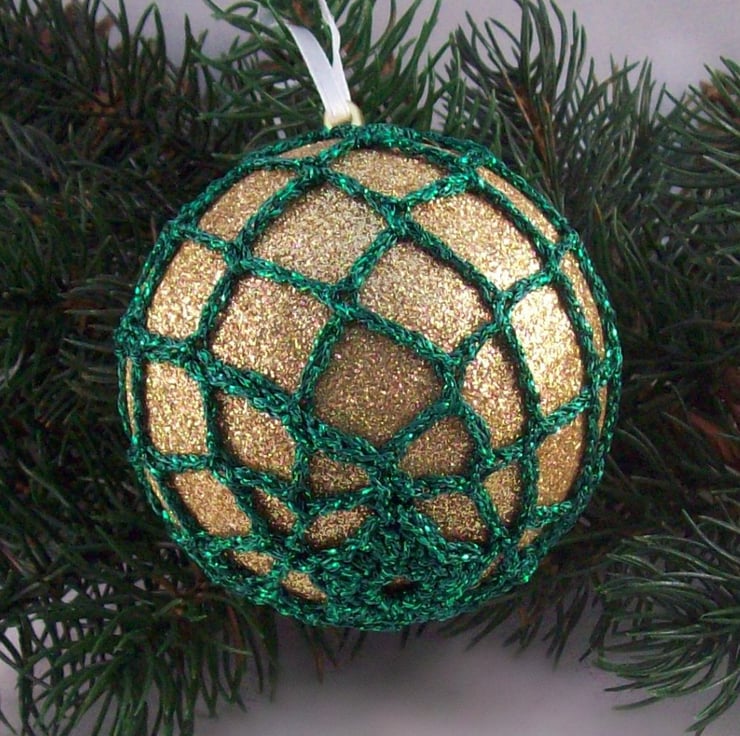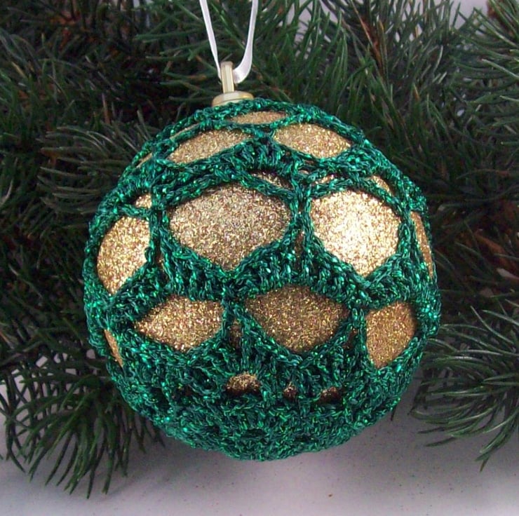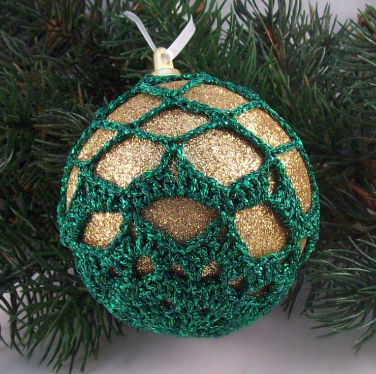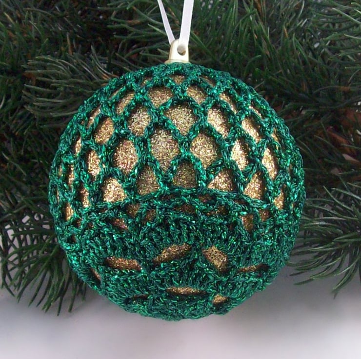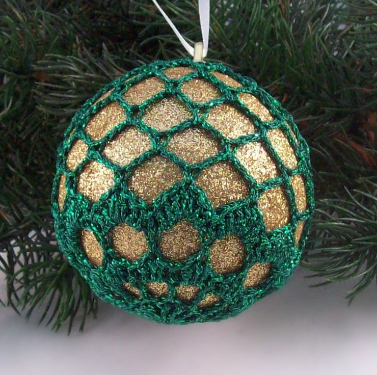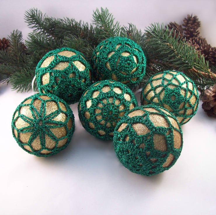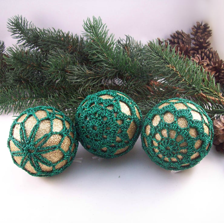 Discover the charm of this unique set of exquisite glittery gold baubles, beautifully enhanced with hand-crocheted lace in a green colour of sparkly Twilleys Goldfingering—an enchanting addition to your Christmas tree!