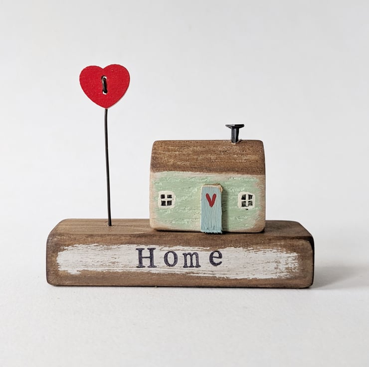 A hand stamped wooden base with a teeny painted house and a jolly button on a wire to stand beside it.