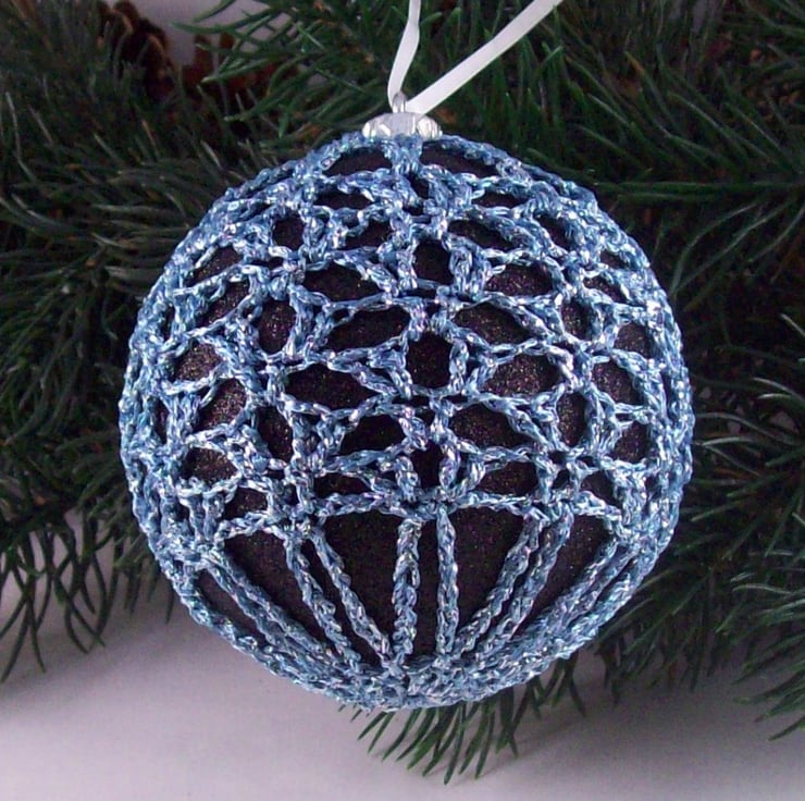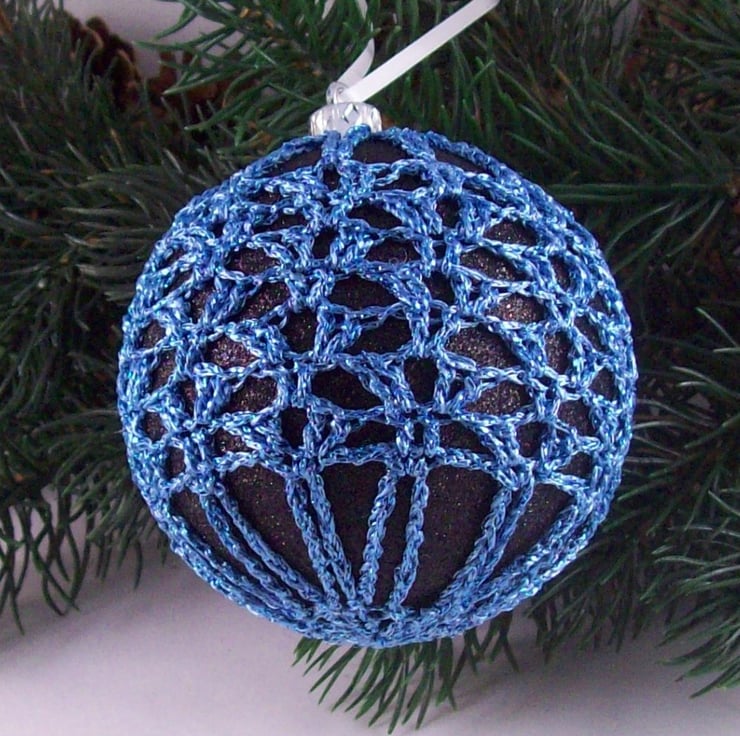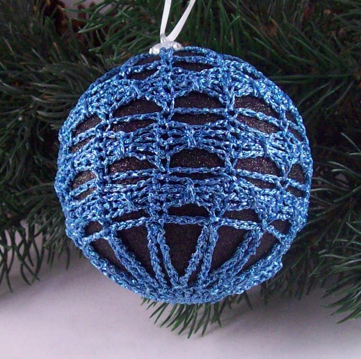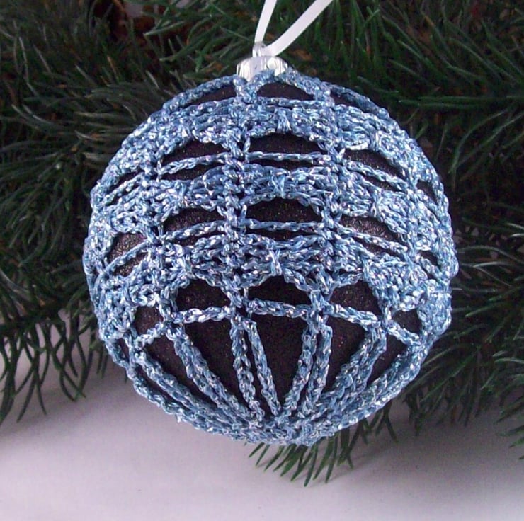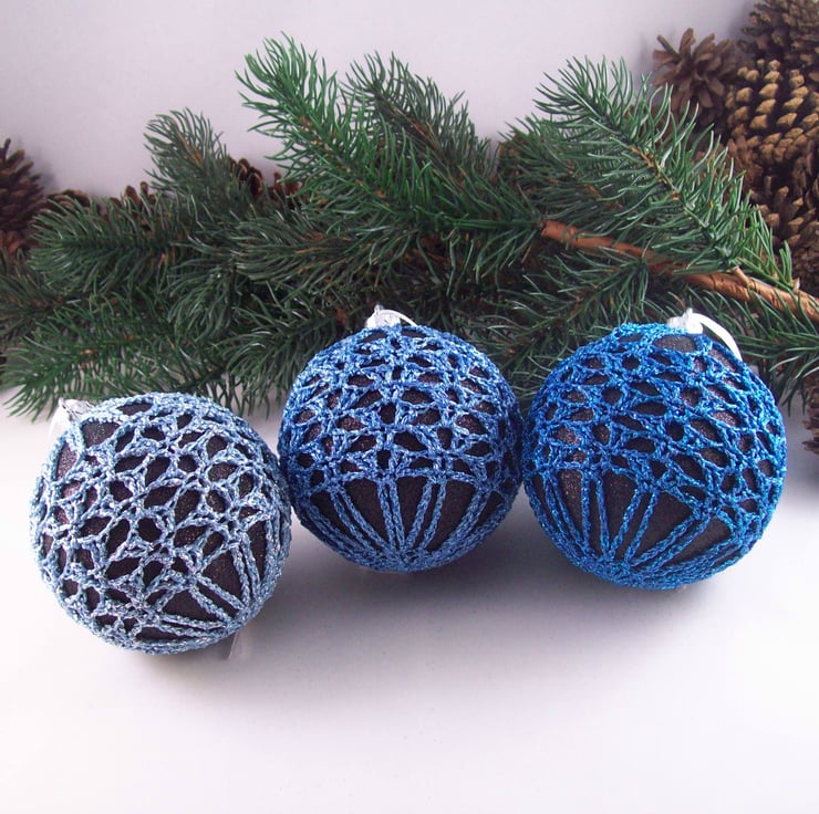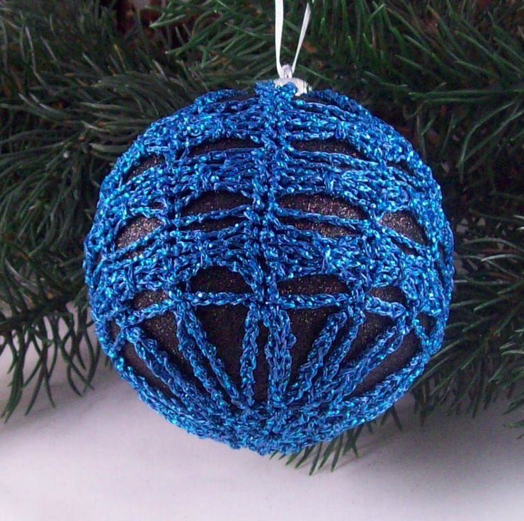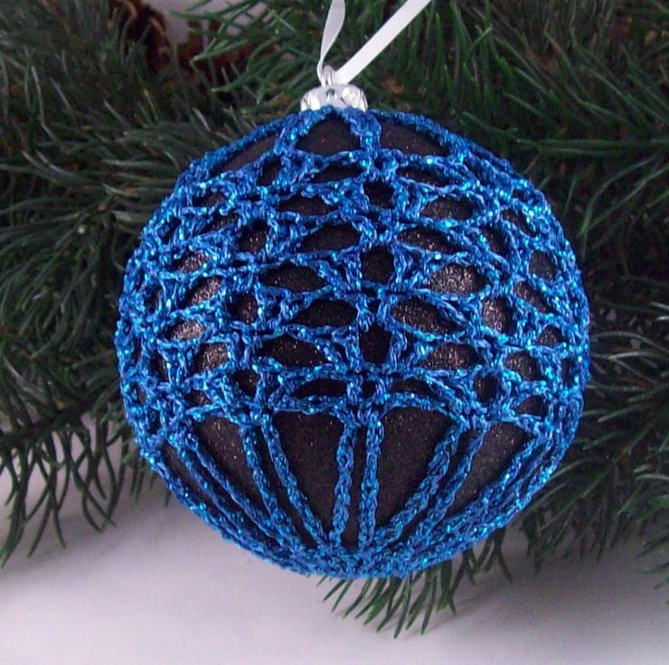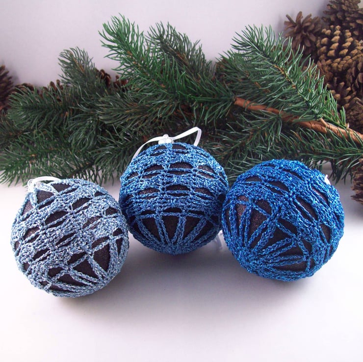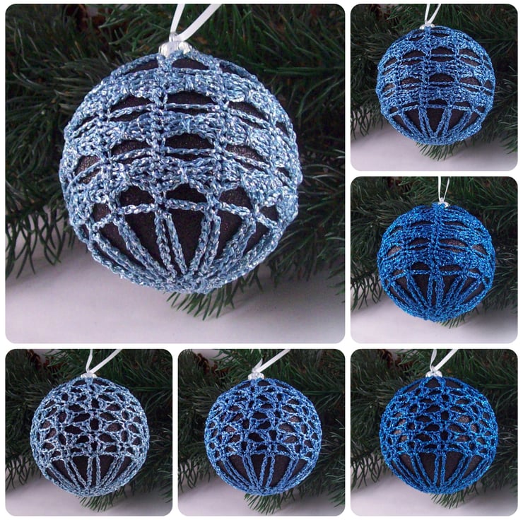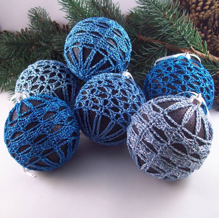 Discover the charm of this unique set of exquisite glittery black baubles, beautifully enhanced with hand-crocheted lace in different shades of blue colours of sparkly Twilleys Goldfingering—an enchanting addition to your Christmas tree!
