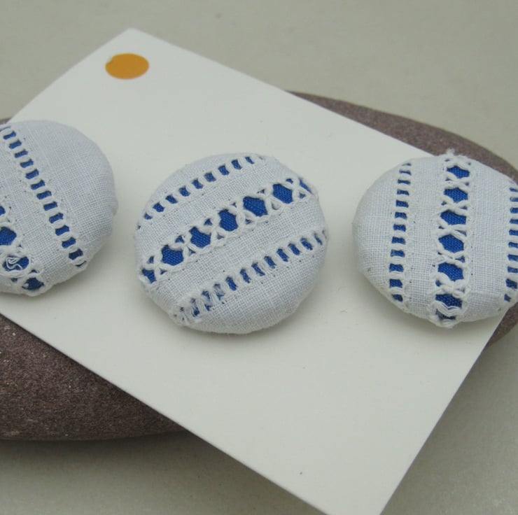 Set of 3 handmade fabric buttons, 3.1 cms diameter on a white nylon base and shank.