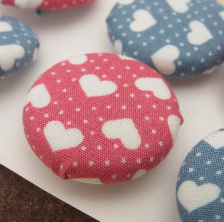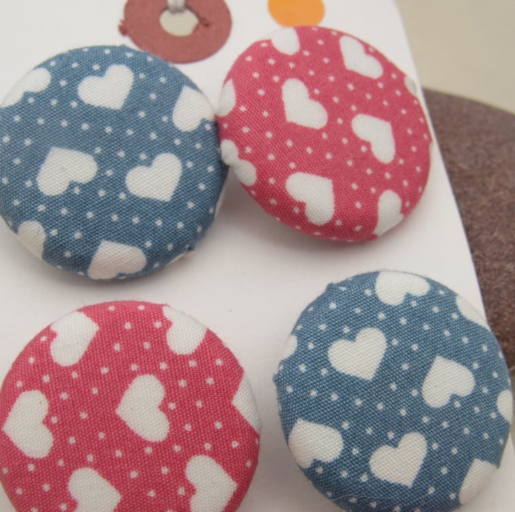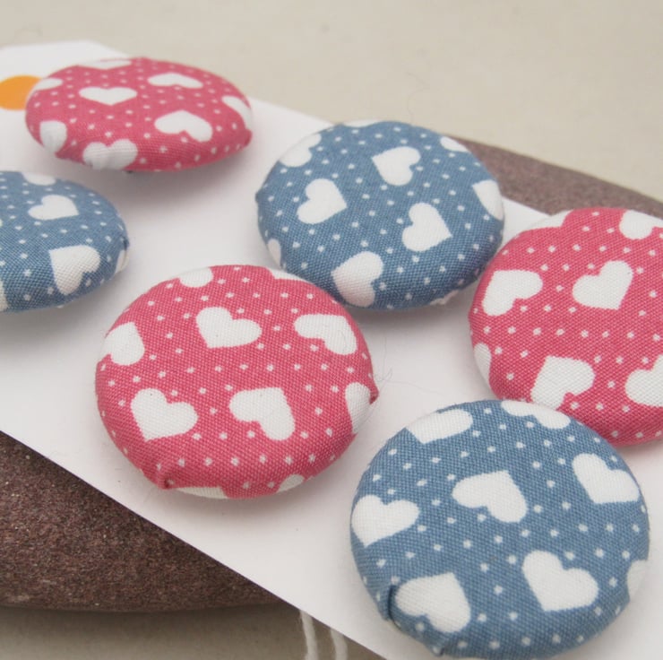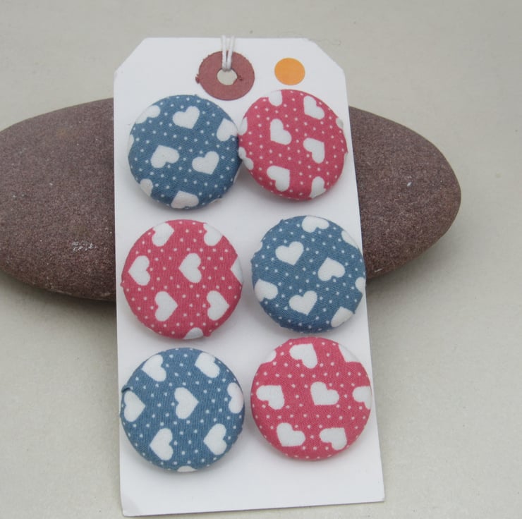 Blue and pink cotton, patterned with white hearts - 3 buttons of each colour.