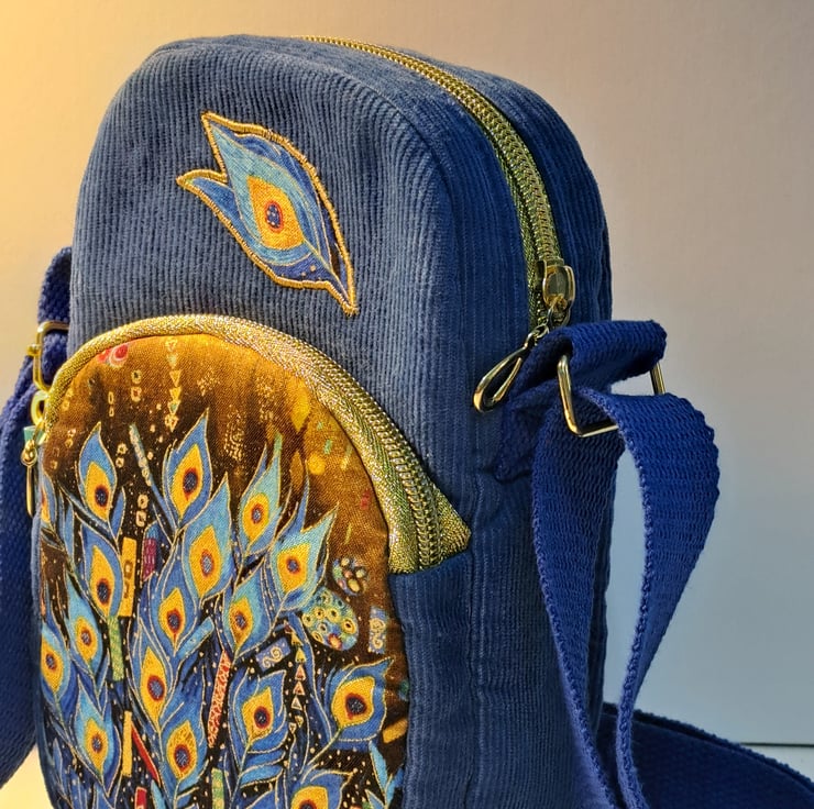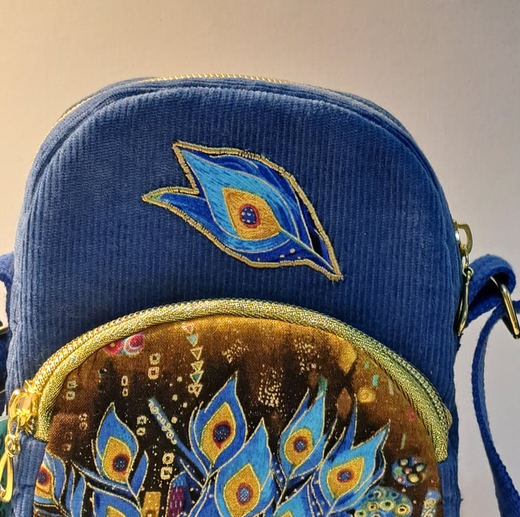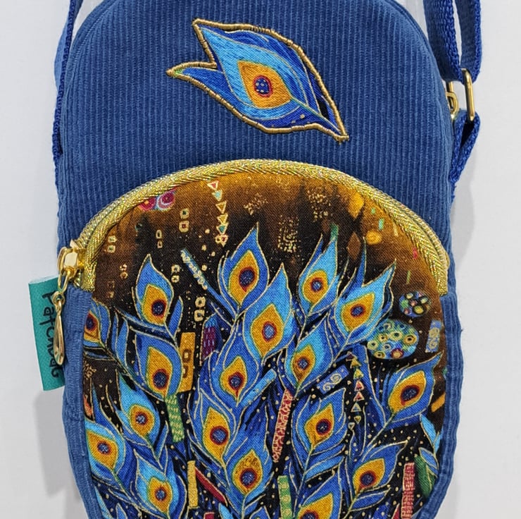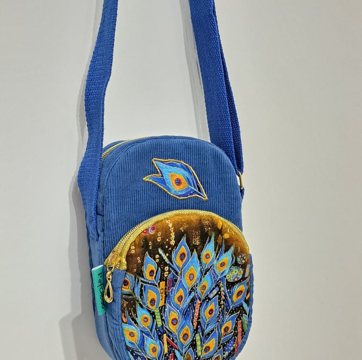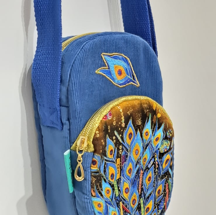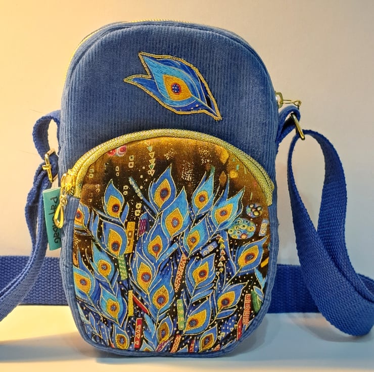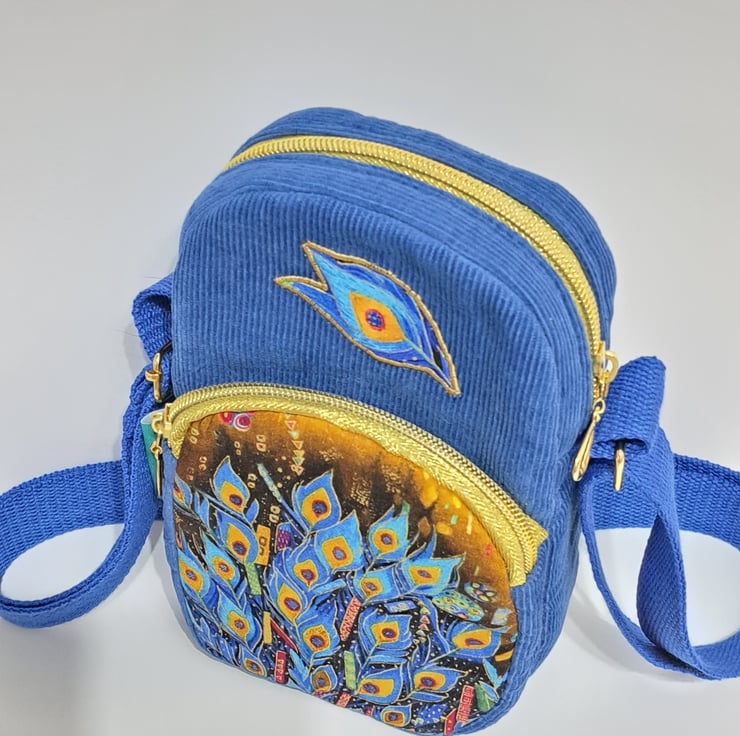 Blue corduroy phone pouch mini bag with peacock feather pattern with golden metallic details. . The bag decorated with applique peacock feather. The bag closing with golden zip on the top, has front pocket also golden zip closure. This little bag ideal for essentials as mobile phone ,keys etc. Perfect for holidays, can put in your passport. The shoulder strap is adjustable, can use as a shoulder bag or as a crossbody bag. The lining made from waterproof fabric. The dimensions of the bag are the following: hight 20cm, width 13cm, depth 5cm. The front pocket depth 2cm.