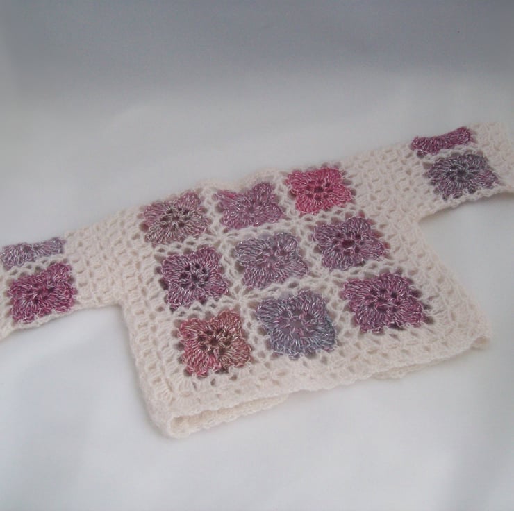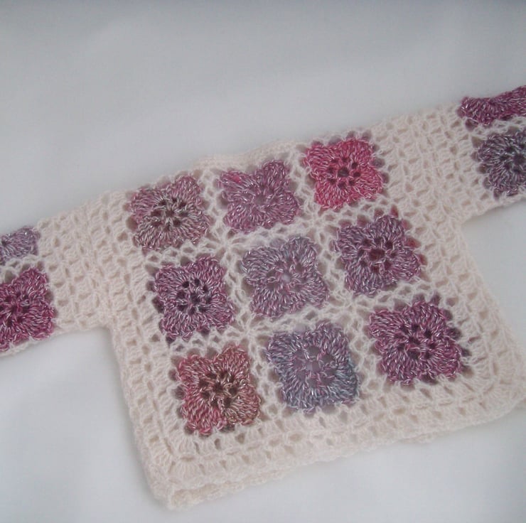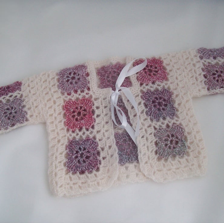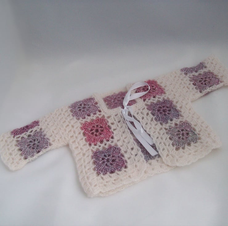 This delightful crochet baby cardigan in the first size has been lovingly handmade using a sparkly, multi-tonal yarn that showcases a variety of pink hues, complemented by a classic, non-sparkly white yarn.
