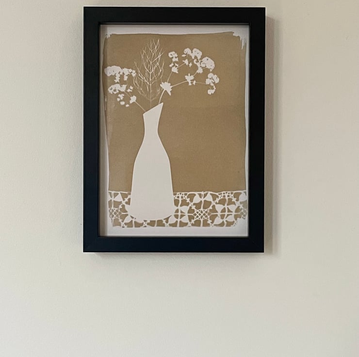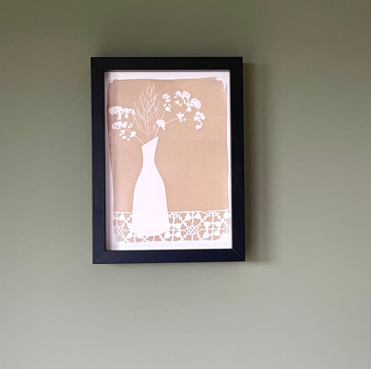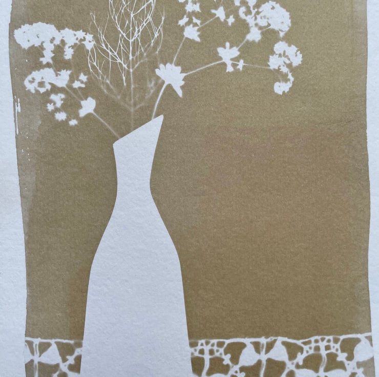 This cyanotype is bleached and dyed in a green tea solution to produce the soft brown hues that compliment neutral decor. Again, like the process of creating a cyanotype, the process of dying a cyanotype is completed fully by hand and so tones and colours vary. The slight unpredictability of the technique adds to its appeal to me as each print is truly original.