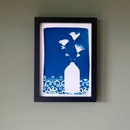 Cyanotypes are one of a kind prints as they are created by exposing light sensitive coated paper to sunlight - each print is affected not only by the composition of botanicals but also by the sunlight conditions.