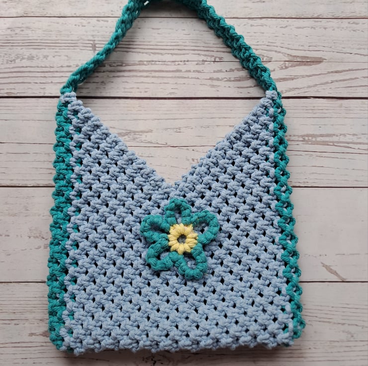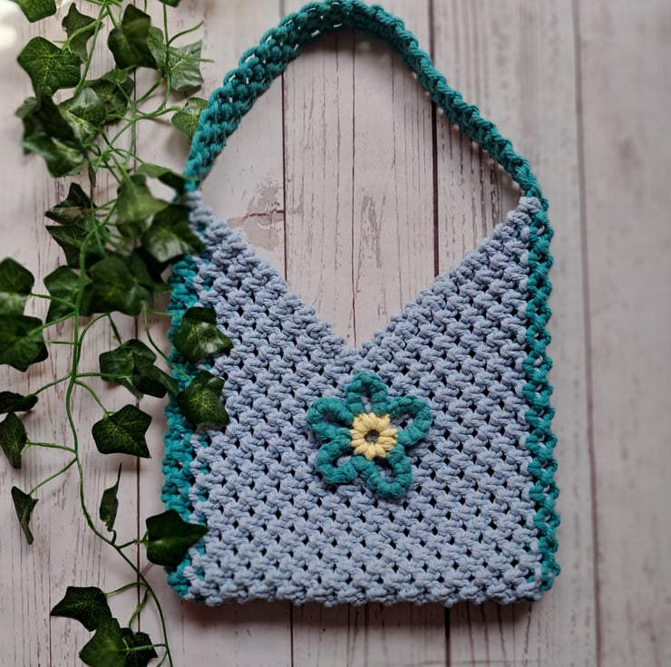 Macrame shoulder bag in blue and teal, with a teal blue flower with yellow centre.